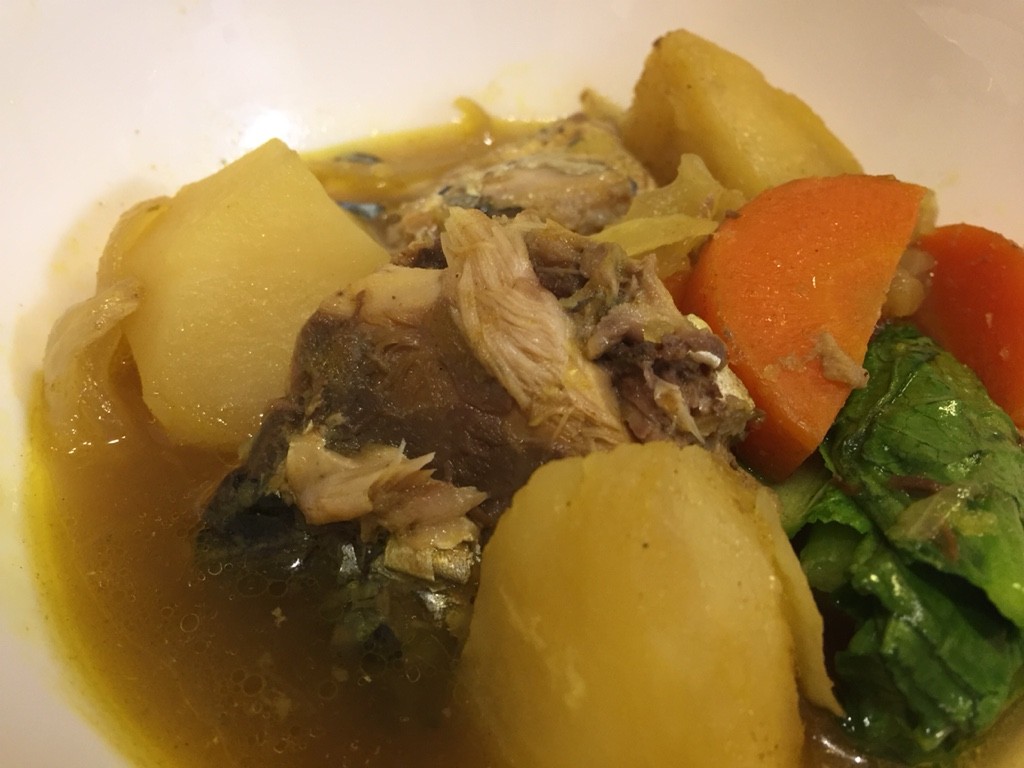 ・鍋に上記の野菜とサバ缶を汁ごと入れ、ひたひたまで水を足し、めんつゆを適量入れて薄めの味付けで煮る