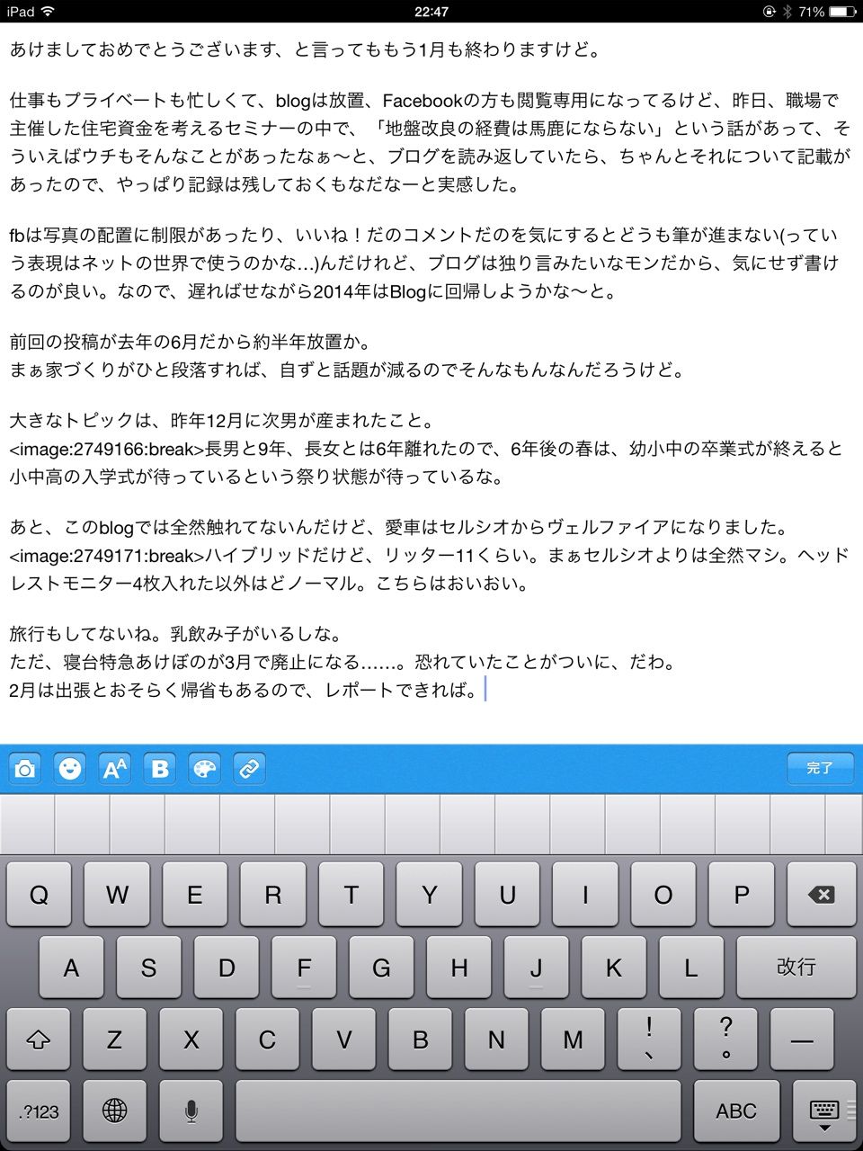 一方、blogは基本PCから入力するし、レイアウトなどもある程度考えなければならないので面倒という点もあるのだが、長文を打てる、写真を自由にレイアウトできる点では、 フレシキビリティが高いうえに、キーボードでパカパカと入力できるので、やっぱりblogがいいなぁ、と。