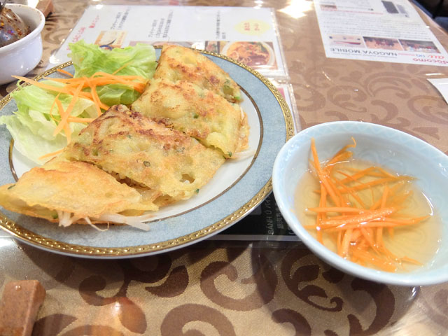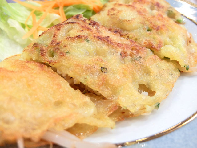 米粉を使ったベトナム風お好み焼き。生地が米粉なので表面がサクサクと香ばしくて美味しいんだよね。