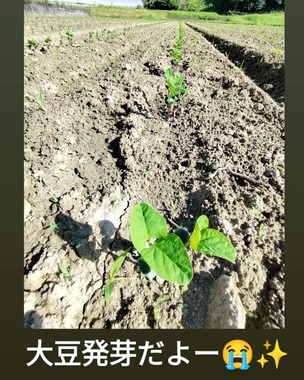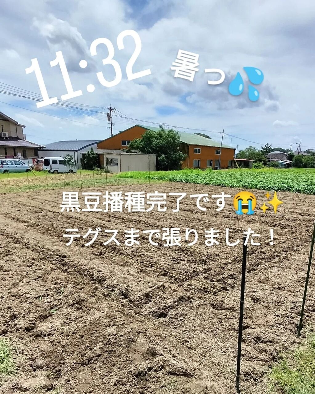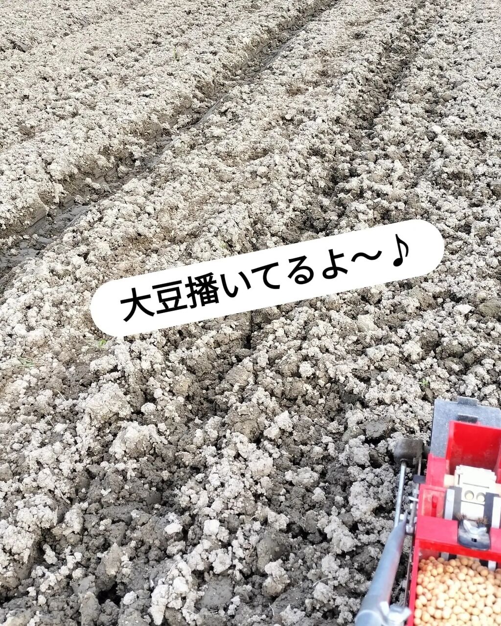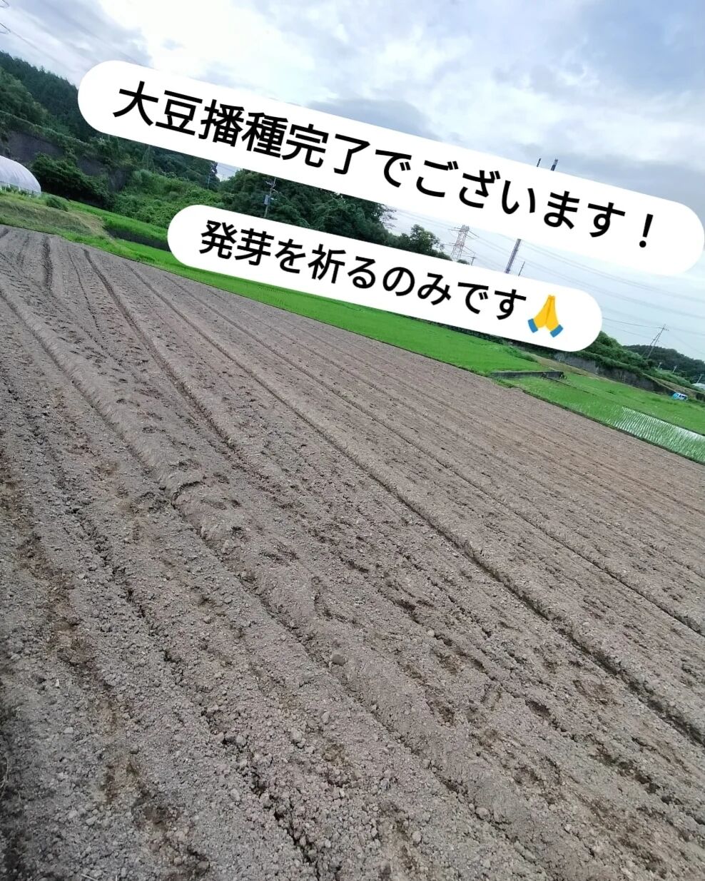 2023年07月26日 大豆SP参加者様へ 播種完了、発芽確認 大豆播種完了(7/18夕方)しましたので報告致します。梅雨の長雨、豪雨でいつ播いたらいいんだよーって頭抱えてた案件で、今年は耕運2回でいいね♪って思ってたけど、やっぱ雨上がりこんな感じ…草も生えとるし溝はなくなっとる…愚痴っても埒あかないし乾かすのに3日はかかるかな…と思ってたけど、あんだけ雨が降ったけど、2回の耕運のタイミングも良かったのか、なんとかトラクター入れられそうなので、とっとと耕して(7/17AM)うーん、美しい✨絶対に明日播くぞ!(明後日雨予報だから)と意気込み、宮浦へ移動し草刈りも頑張りました!!宮浦の黒豆は午前中に種播きしてテグス張りました鳥の食害を防ぐためです城戸の大豆ももちろんしっかり鳥に狙われますしかし、テグスまで張るには広い…(黒豆の6倍くらいの広さある)張ったら張ったで片付けも大変なのでせんでいいならしたくないので鳥達がお山へ帰る時間帯、そして夜中には雨が降るって予報の日を狙って播くのですと言ってもまだまだ日が長いから心配よね…大豆が露出しているところに丁寧に土を被せる作業を妹に手伝ってもらいましたそしてなんとか大豆播種完了です!どうぞ祈って下さいませ❤一面緑にワサワサと大豆が茂ることを美味しい味噌を作る日のことも想像しながら追記(2023/07/26)7/24には大豆発芽確認致しました!早かった!!!めっちゃ嬉しいです😭✨今からは草との闘いです!頑張りまっす💪また今後の成長具合はブログにてお知らせ致しますインスタグラムでは日々の活動せっせと投稿しておりますのでぜひご覧下さいませ❤ともはぐ農woman茜
