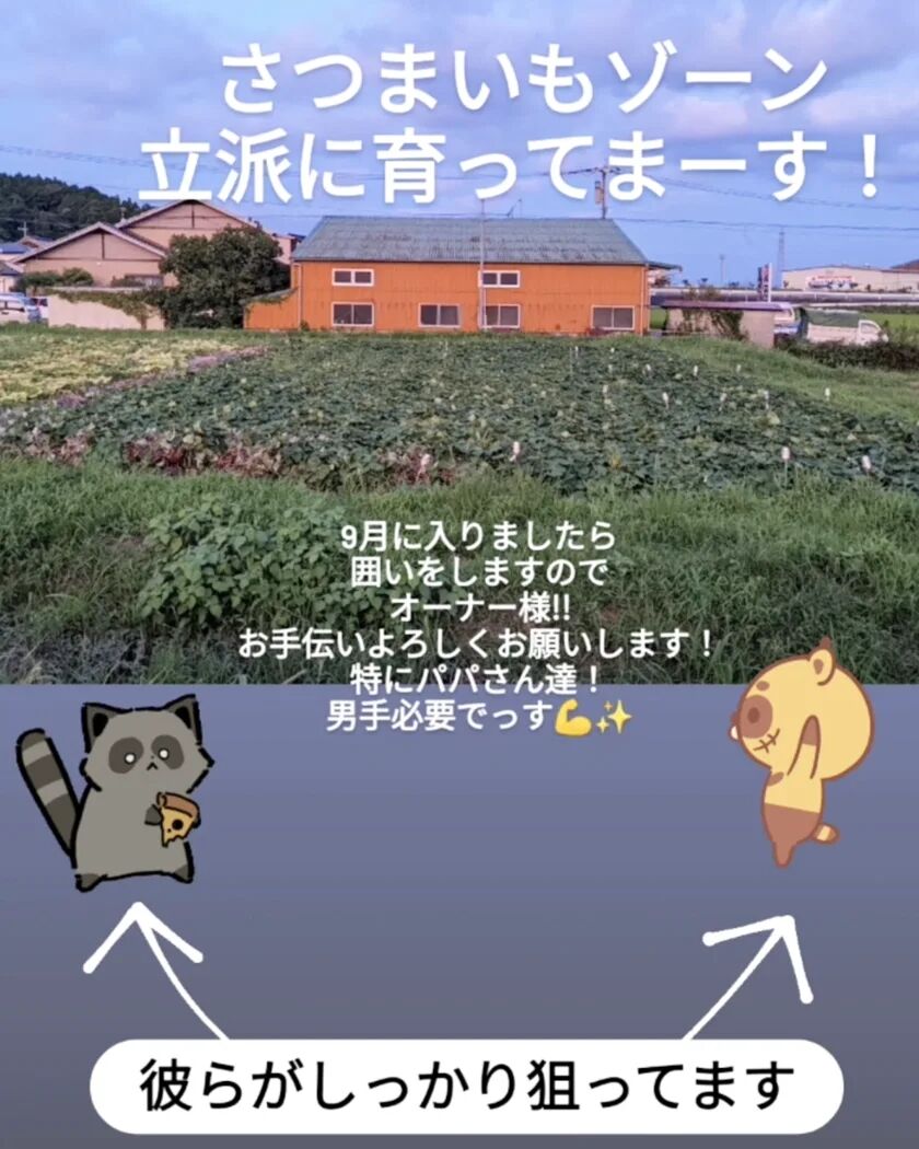 2023年08月31日 さつまいも囲い設置のご案内 何者かによる足跡がちょこちょこ確認され始めるこの頃🐾9/9㈯7時〜にさつまいも囲い設置致します!さつまいも区画オーナー様、どうぞご来園下さい!ホントは6時からしたいので、6時から来れる方はメッセージ下さい!9/9㈯が雨の場合、翌日9/10㈰に延期と致します。ひとりでも多くの方にご参加いただければ幸いです。食欲の秋は人間だけに限りません!野生動物も冬を乗り切るためにしっかりと蓄えたいでしょうから…ボーッとしてたら見事に食べつくされてしまいますので、先手を打ってバシッと囲いをしていきたいと思います。さつまいもゾーンだけを杭とネットで囲っていきます。お母ちゃんたち!お父ちゃんをどうにかこうにか引っ張ってきてくださいませ~よろしくお願いしますm(__)mともはぐ 農woman茜