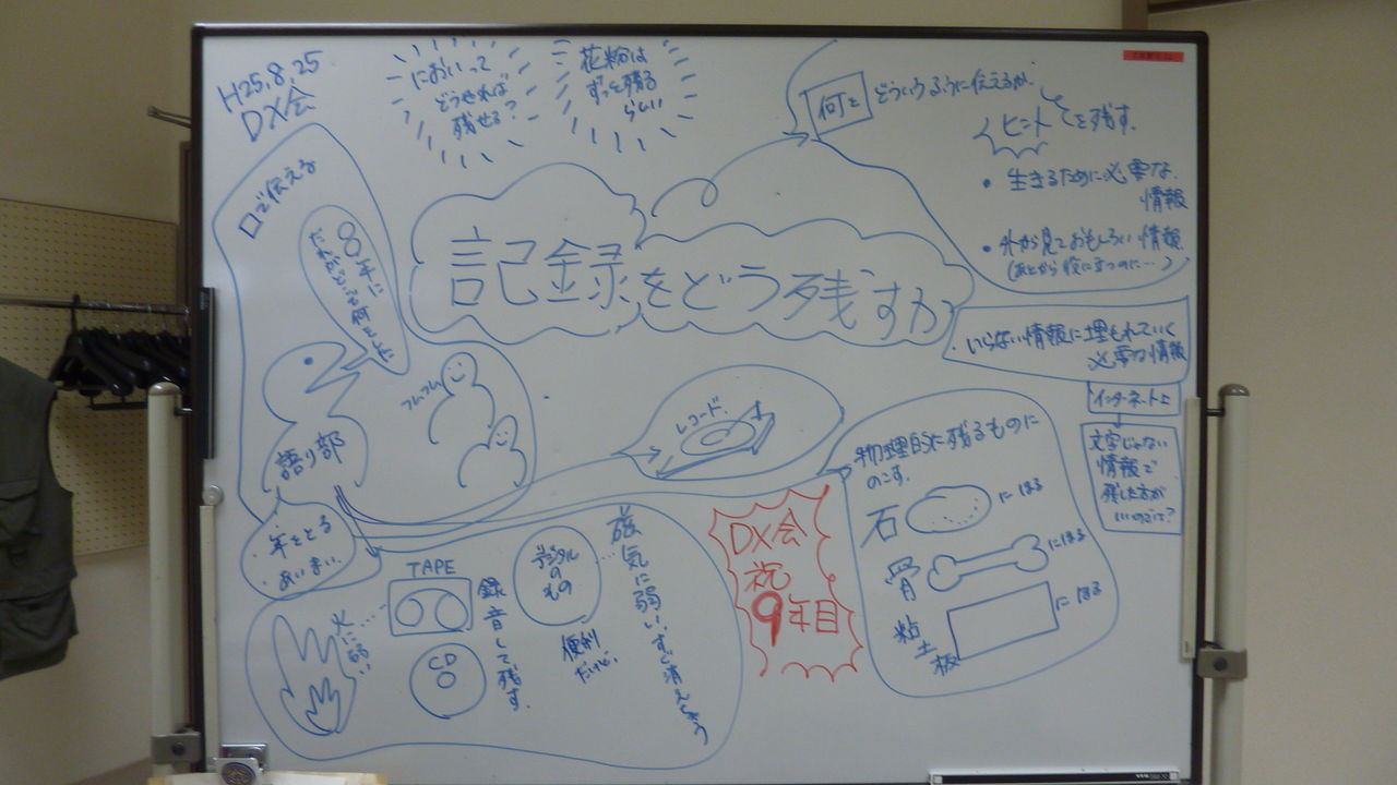 後半は「記録をどう残すか」で意見を出し合いました。なんでも、かんでも記録を残しても、仕方がありません。本当に大切なものだけ残すだけで十分です。次に、どんな方法で残すかを考えました。「語り部:伝承で代々の語り残していく」「紙に絵や文字を書いて残す」「レコード」「フイルム」「サーバー」などに情報を残すとしても、それぞれ一長一短があり、確実ではありません。石か、動物の骨に刻むほうが残るではないかという意見が出ました。花粉か、匂いで残すほうが、もっと伝わるのではないか、と考えた人もいました。多くの情報を文字や絵で残しても、確実に残るわけではありません。文字や絵だけに頼っているだけでは伝承されなくなるのではないか、という意見がありました。「ピラミッドや仏像などを作って、考えるヒントを与えたほうが良い」という意見が出たところで終了の時間になりました。