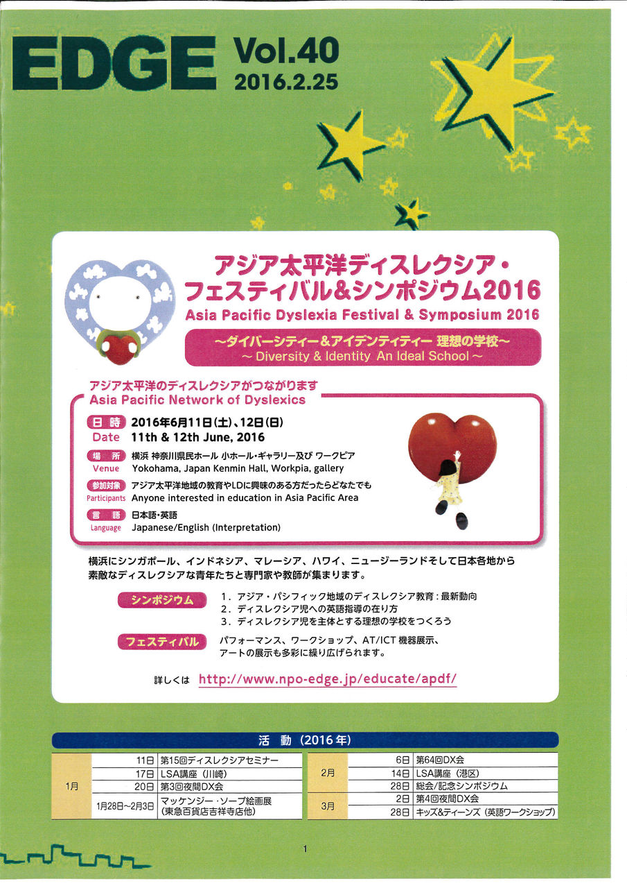 ‐ アジア太平洋ディスレクシアフェスティバル&シンポジウム2016@横浜、6/11-12日