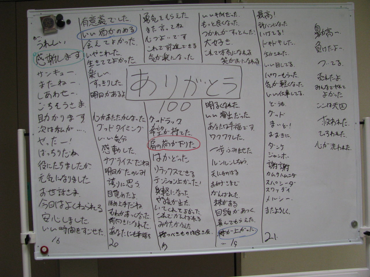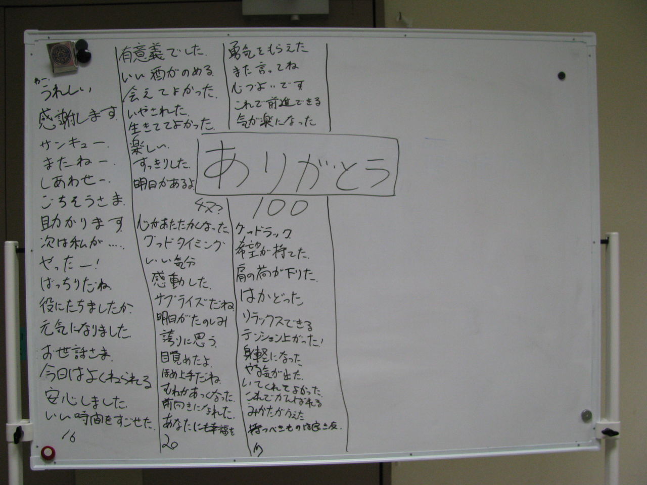 100個、出てきましたが「ありがとう」は意外に難しく、なかなか出てきませんでした。お礼のことばは「ありがとう」で済ませていて、他考えたことがなかったのかもしれません。少し休みを入れ、話し合い、どんなとき「ありがたい」かを考えてみました。自分が「楽」になったり、「勇気」が出たりしたときです。これを手がかりに、考えました。DX会では珍しく、なかなか答えが出ず、苦労しました。