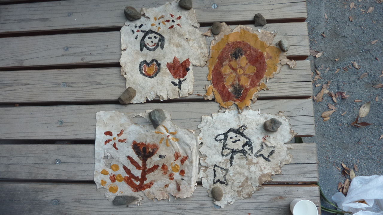 遊ぶだけがDX会ではない。DX会ではワークショップを行うことになっています。百花園隣の公園で、天然素材の絵具、紙、筆を使って、いつものように、「頭にうかんだこと」を絵にしてもらいました。