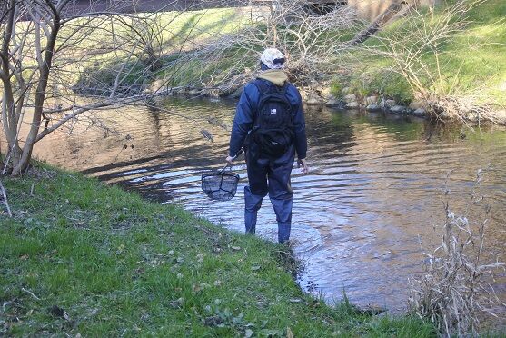 参加者2人が網を持って、川に入りました。他の4人で、川岸で、獲物の居そうな処を探しました。