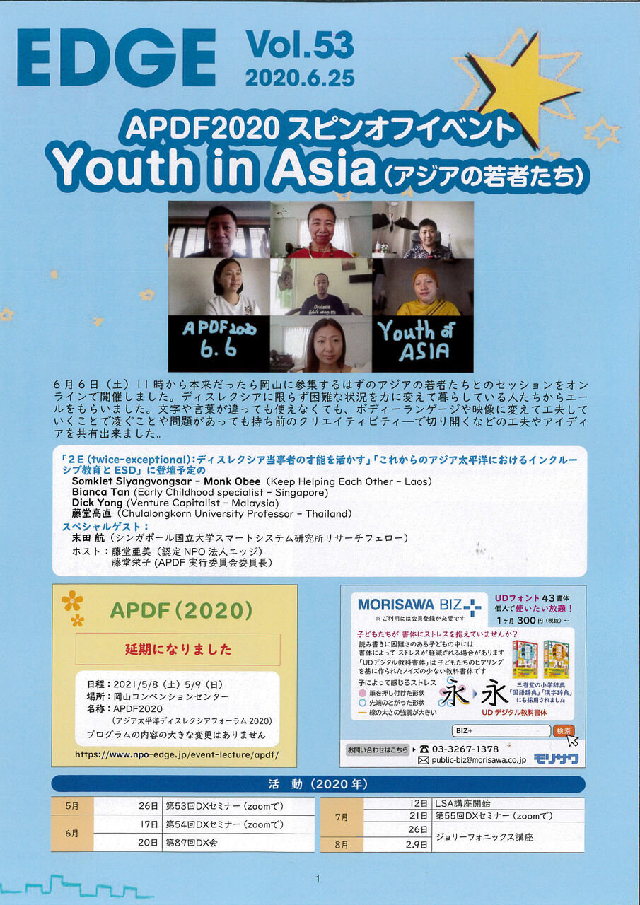 ニュースレター53号を2020年6月25に発行いたしました。本紙は、ディスレクシアの啓発及び支援活動の一環として、「Youth in Asia(アシアの若者たち)、DXセミナー、LSA養成講座、ディスレクシアに関するご相談、読み書きの簡易アセスメント、MOOC(教員・支援者向けオンラインコース)、BEAM(音声教材)、ジョリーフォニックス講座、DX会」などの記事を掲載しております。