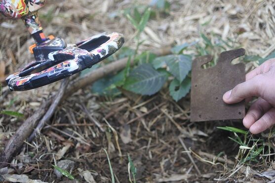 試しにおもちゃの金属探知機を使ったら、反応がありました。近くを掘ってみると、小さな金属の