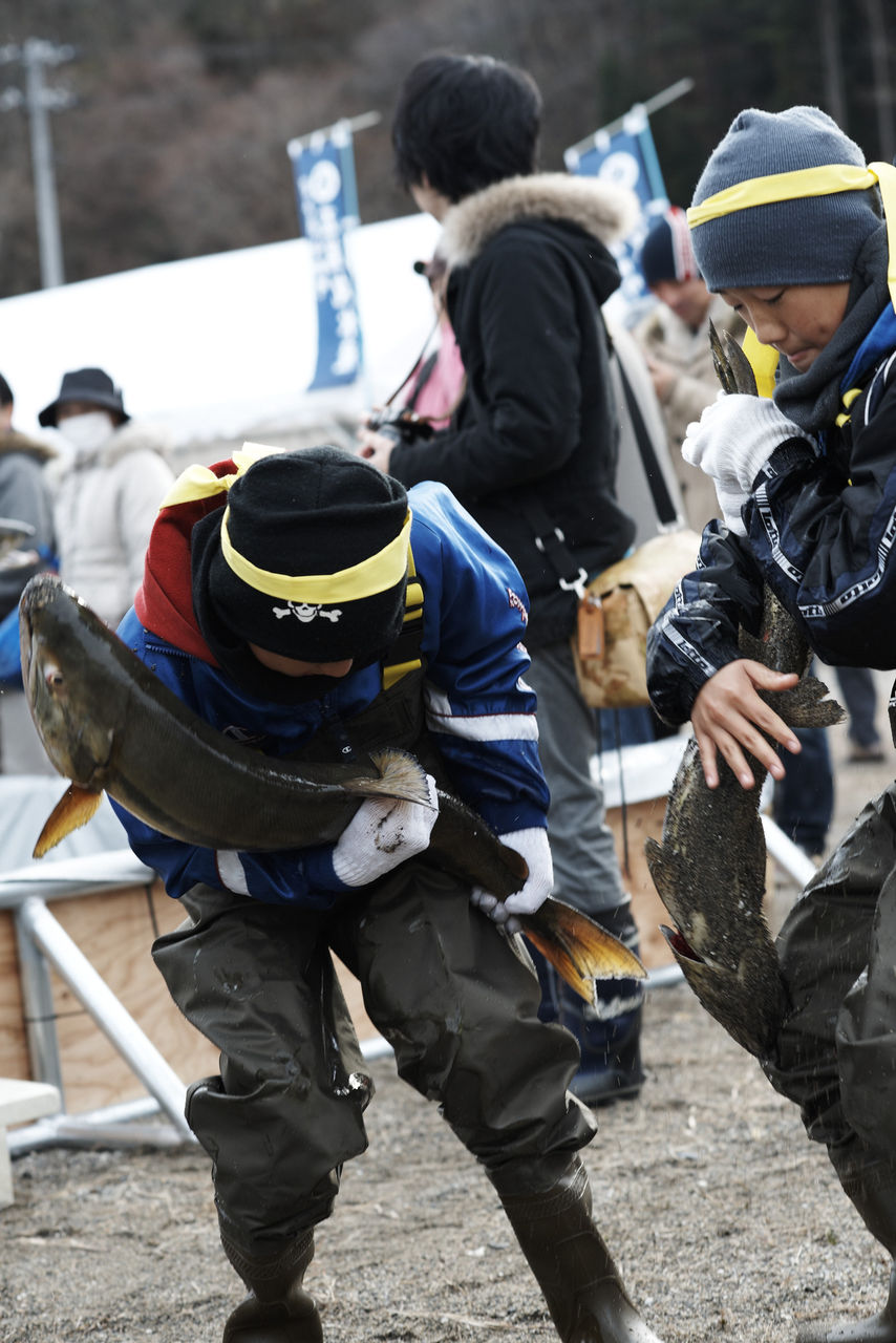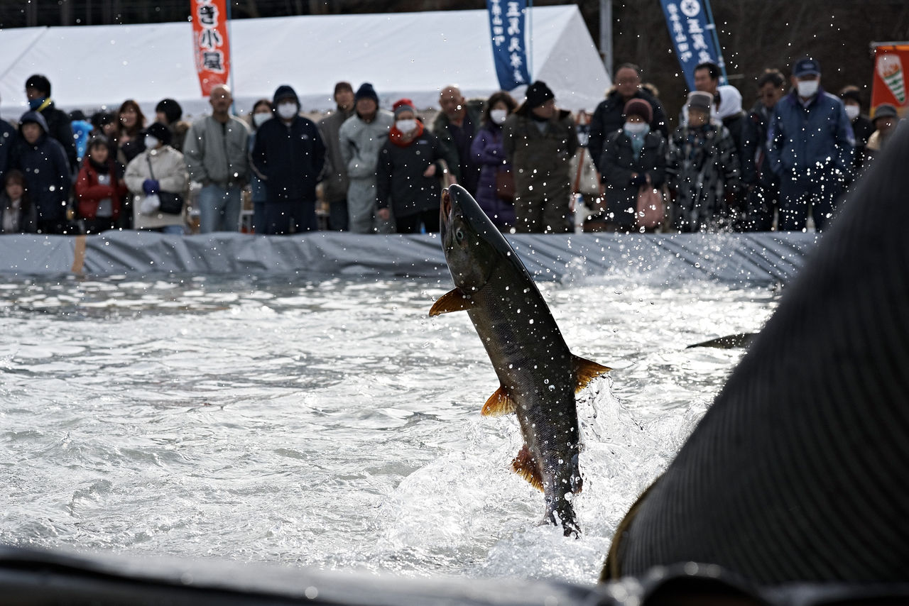 「よーいスタート!」の合図で一斉にプールに入り、子供から大人までお目当ての鮭を追い掛け回していました。見ていると、みなさん結構簡単に捕まえられるものなんですね