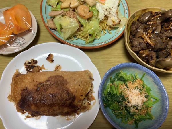農夫の夕げあんかけ海鮮塩焼きそばこれはインスタントではありません自分で作りました羽島団子と言う所のお好み焼き鶏肝の煮物正月菜のごまあえ岐阜の富有柿 ...