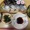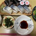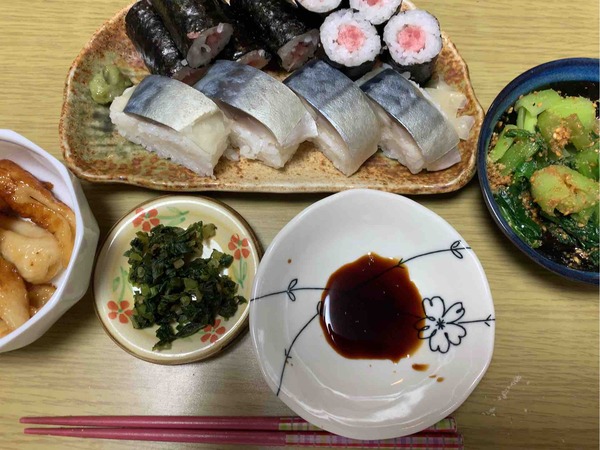 農夫の夕げ鯖の押し寿司ねぎとろ巻ほうれん草のごまあえちくわの甘辛煮とおつけもの ...