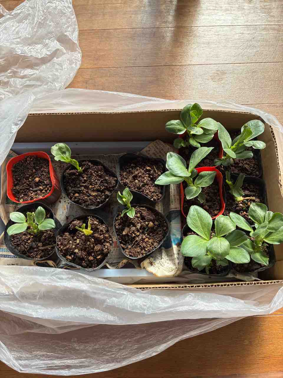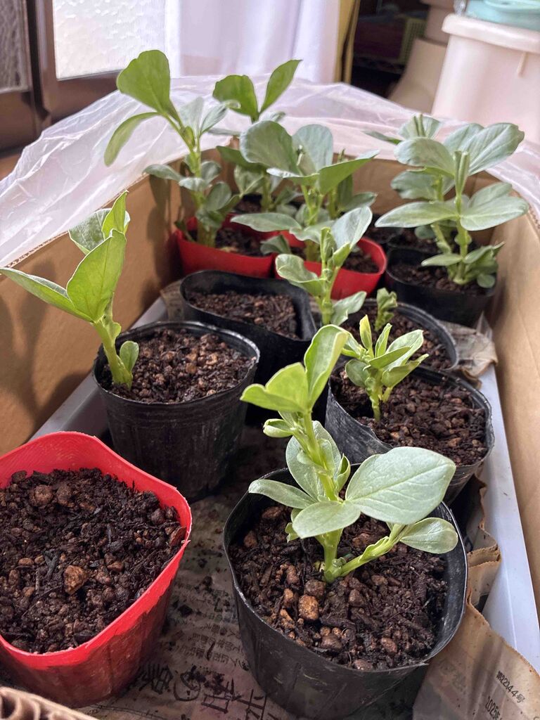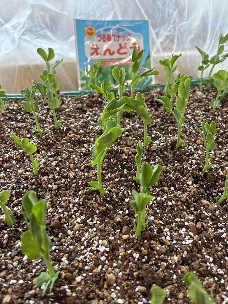 りぼんの縁側にそら豆やえんどう豆を育苗している。