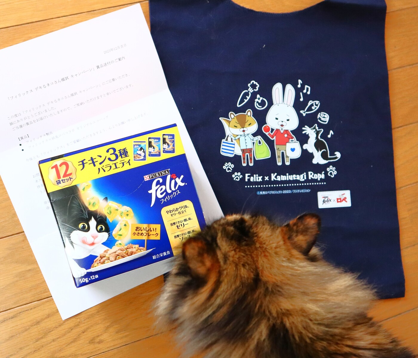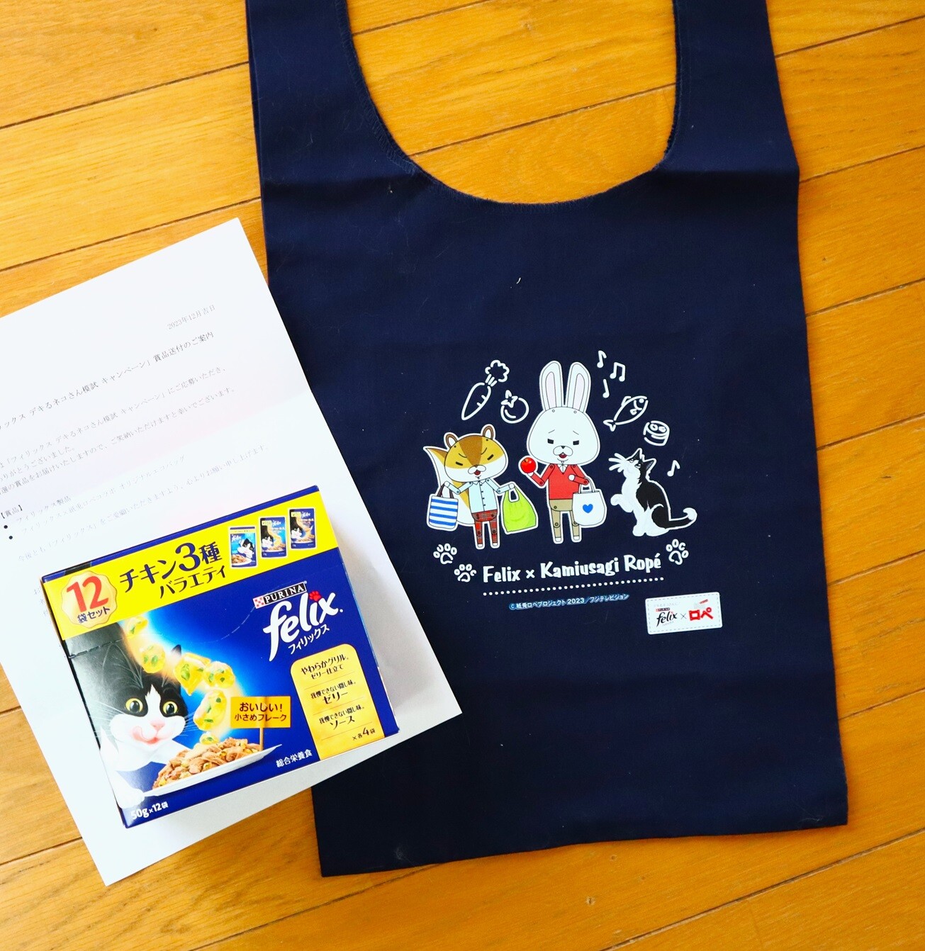ネスレ ピュリナ フィリックスさんの、デキるネコさん模試キャンペーンで、成猫 チキン3種バラエティと、フィリックス×紙兎ロペコラボ オリジナルエコバッグをいただきました。