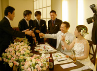 披露宴にて中工場teamに囲まれる新郎新婦。