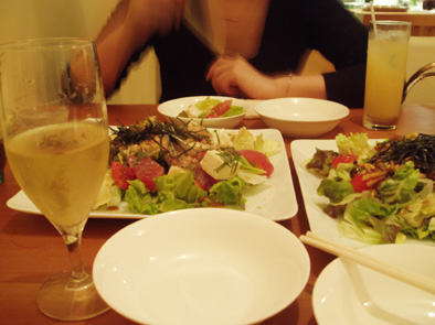 昨日は「豆腐とマグロのサラダ」と「きのこの和風サラダ」、あとバゲットにトマトを乗っけたブルスケッタとワインをオーダー。野菜そのものもおいしいし、ドレッシングもおいしいし、サラダにしては量が多いからこれだけでも全然OK。しかもヘルシー。女子的に文句なし!