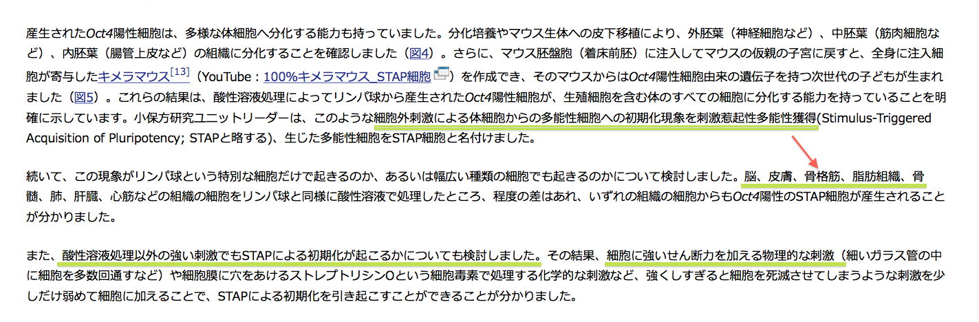 「物理的ストレスで体細胞が初期化され、多能性を持つ」とされるSTAP現象と同じ原理が記されている。キメラマウス実験でもこの体細胞から多能性に変化した多能性細胞は脳や肺、心臓にそのGFPが認められた。※参照の事。