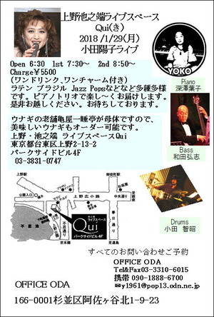 2018年1月29日(月)上野池之端ライブスペースQui(き)今年の初ライブです。老舗の鰻屋さんが母体なのでご希望であれば美味しい鰻もご注文になれます。Open 18:30 1st 19:30〜 2nd 20:45〜charge ワンドリンク ワンチャーム付き¥5500Piano 深沢葉子 Dr 小田智昭 Ba ...