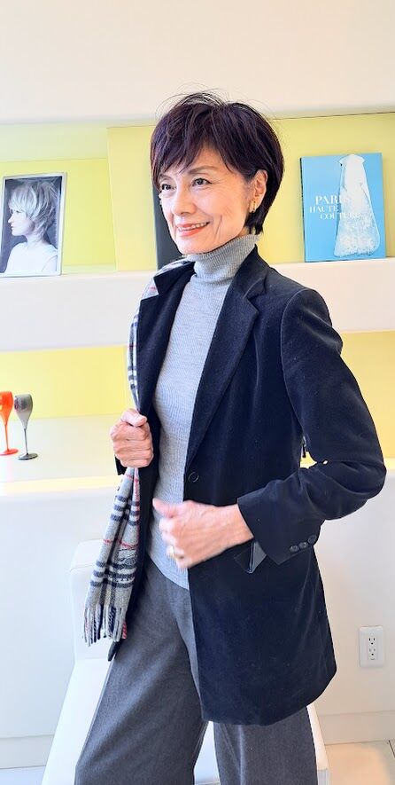 グレー×イエロー大好きな色合わせ 昔のバーバリーのマフラーもトレンド
