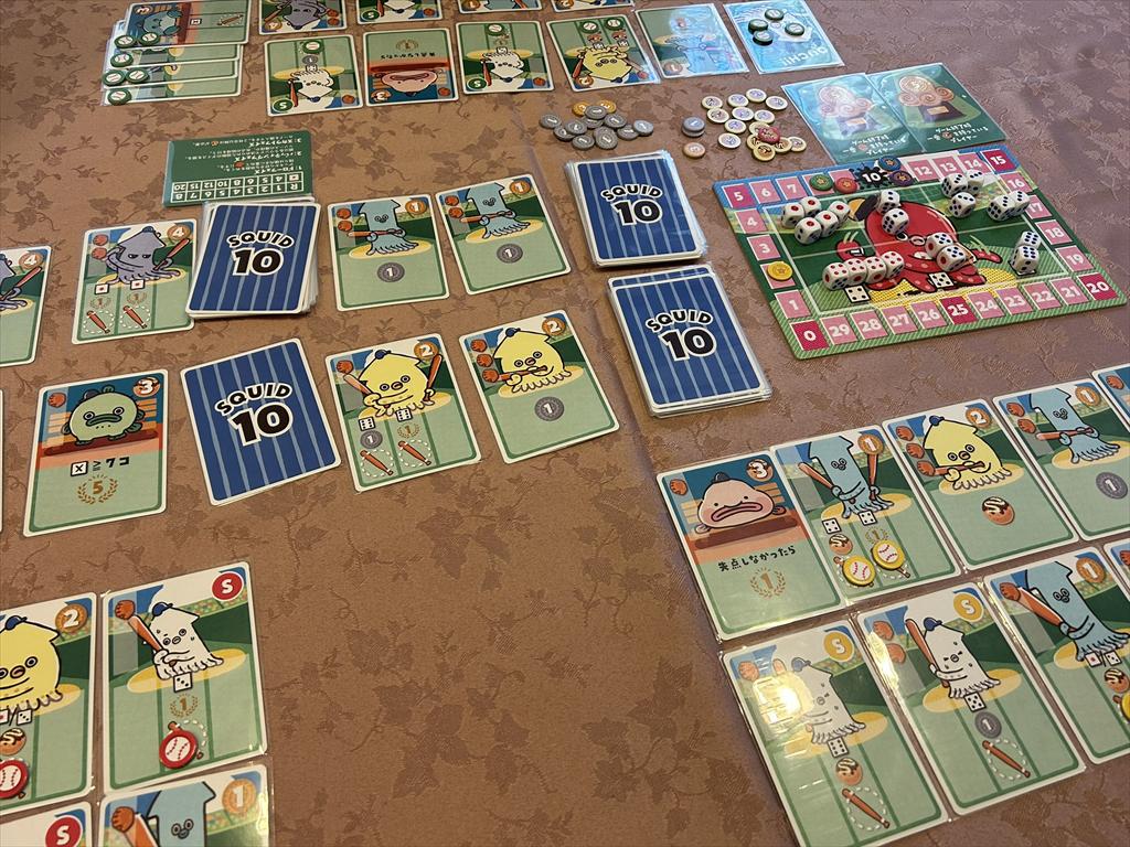 VSクレイジーピッチングオクトパスは、年に一度のイカ野球コンテストで、まとめてたくさんのボールを投げるクレイジー・ピッチング・オクトパスとの8日間に渡る大勝負をするというボードゲーム(カードゲーム)。8ラウンド目が終了したら、ゲーム終了です。ゲーム終了時に、獲得した得点が一番多い人の勝利です。
