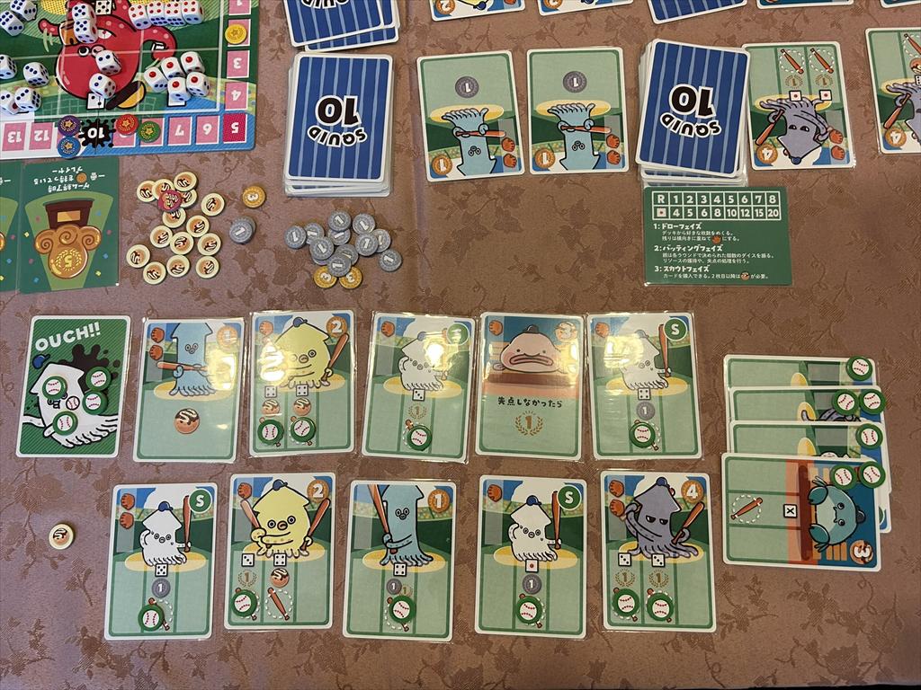 親プレイヤーがそのラウンドで振る数のサイコロを代表して振ります(ラウンドごとにどんどんサイコロの数が増えていきます)。振ったサイコロを目ごとにボード上におき、どの目が何個出たかを分かりやすいようにします。そして、各自で1の目から順番に、各自のカードの上にボールマーカーをおいていきます。目に応じたボールを打ち返す役があればそこにおき、無ければ横向きにおいたカードのグローブの上にボールマーカーをおきます。その両方におけなかった分はOUCH!!カードの上におきます。1~6の全ての目を処理したら、各自の結果を反映させます。