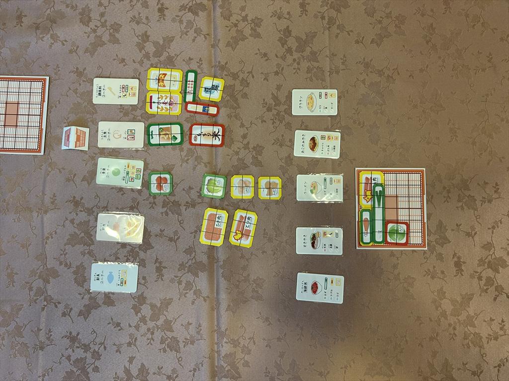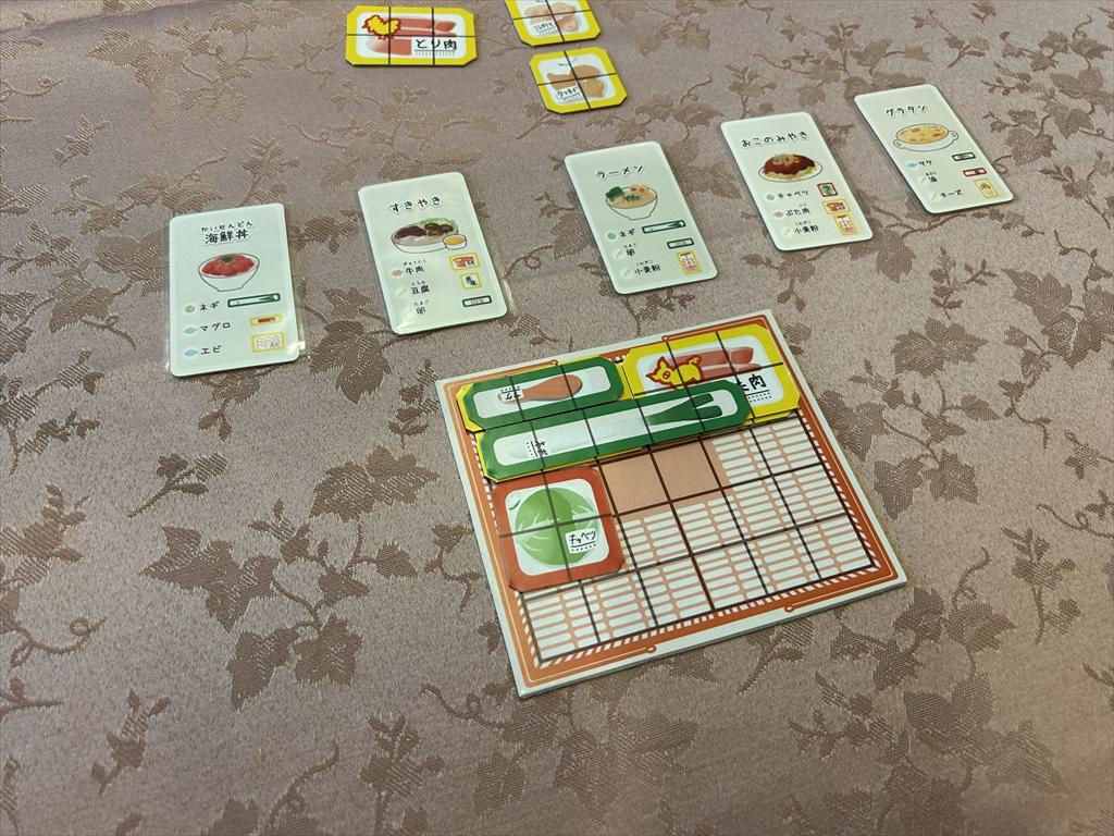 上記④で無事にレジを済ませた食材チップを使って、ゲーム開始時に準備したレシピカードのどのレシピを作ることができるか確認します。全ての食材が揃っているレシピカード1枚につき1点なります。