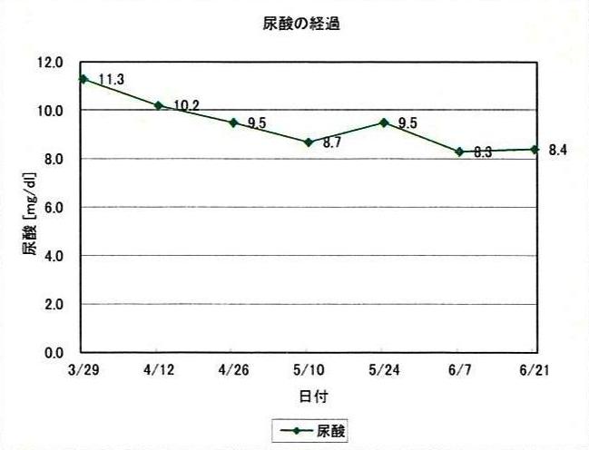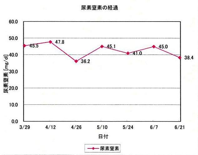 ¥¯¥ì¥¢¥Á¥Ë¥ó7.68mg/dl¡¢Ç¢ÁÇÃâÁÇ38.4mg/dl¤Þ¤Ç²¼¤¬¤ê¤Þ¤·¤¿¡£