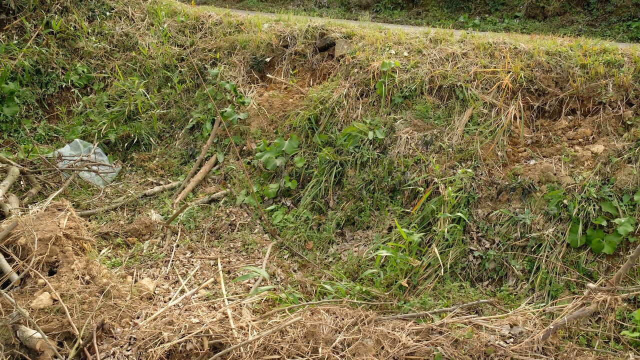 電柱下の崖を猪が崩した。上は道路なので困る。