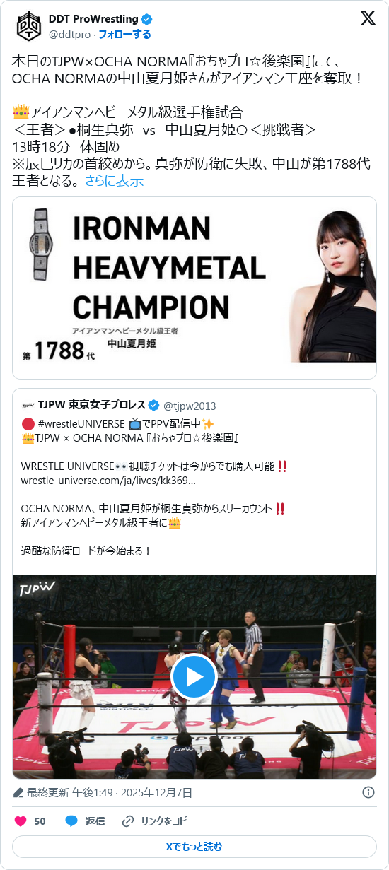 — TJPW 東京女子プロレス (@tjpw2013) December 7, 2025