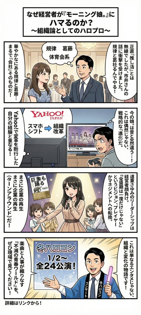 このプロセスが、たまらなく面白い。これはもはやアイドルの話ではありません。組織の話であり、リーダーの話であり、変化の話です。だから私は、ハロプロを観ている。エンタメとしてだけでなく、経営の教材として、そして何より、変わり続けることの価値を思い出させてくれる存在なんです。
