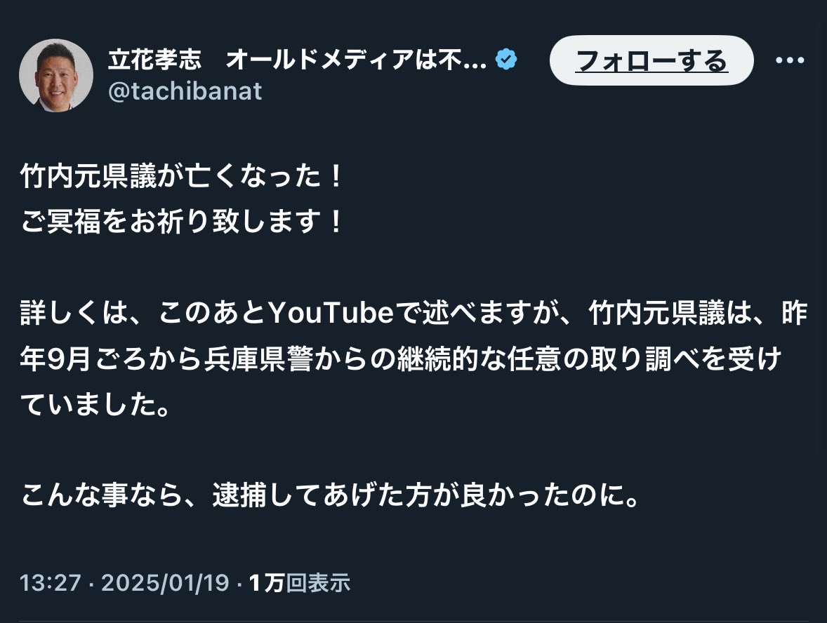 それからはいつ逮捕されるのかが争点になり、なかなか逮捕されなかった中で兵庫県警がやっと動いて逮捕に至ることになった。罪状は竹内元県議会議員の名誉棄損であり、竹内元議員は兵庫県警から取り調べなんて受けていなかったのに任意で事情聴取されたとデマを垂れ流したことが理由らしい。