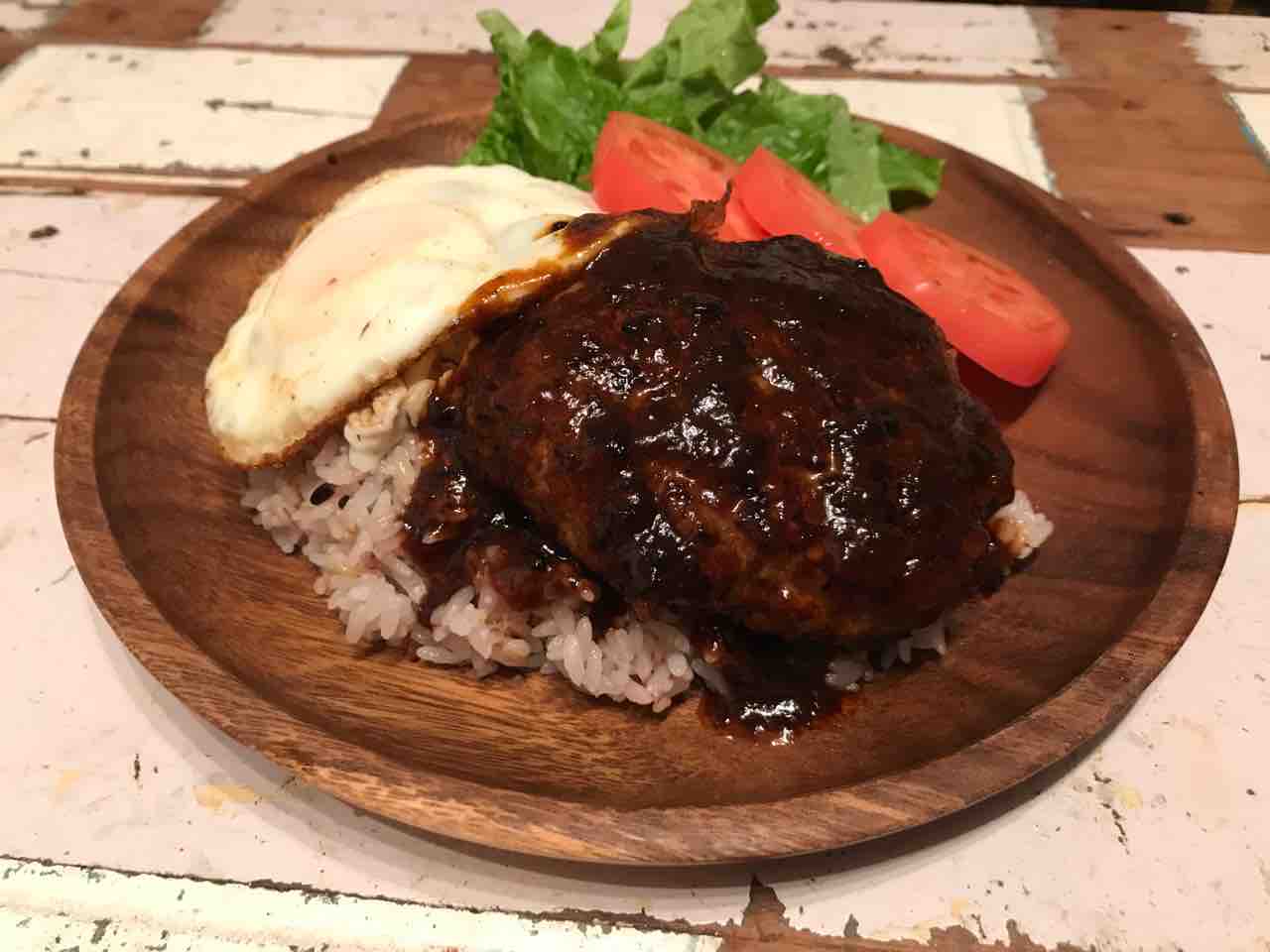 5.ごはん、ハンバーグ、目玉焼き、トマト、サニーレタスを盛り付け、ソースをかける。