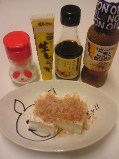 こんにちは。みなさんどうしてますか?何してますか?風邪ひいてないですか?私は今日も日記のネタに困るほど、特に変わった事はありませんでした。でも、久しぶりに冷奴を食べるので写真を撮ってみました。でも、何をかけて食べるか迷ってます。普通に醤油でもいいのですが・・・迷います。せっかくの「ヒヤヤッコ」。ヒヤヤッコってかわいい名前ですね。今まで何で気付かなかったんだろう☆やっぱり「おたまはん」かな。 ちょっと前の日記にも登場したな・・・もうこの時点で私がどんな毎日を送っているかバレてしまいますが、今はそうゆう時期と思って開き直ってます( -д-)ノ