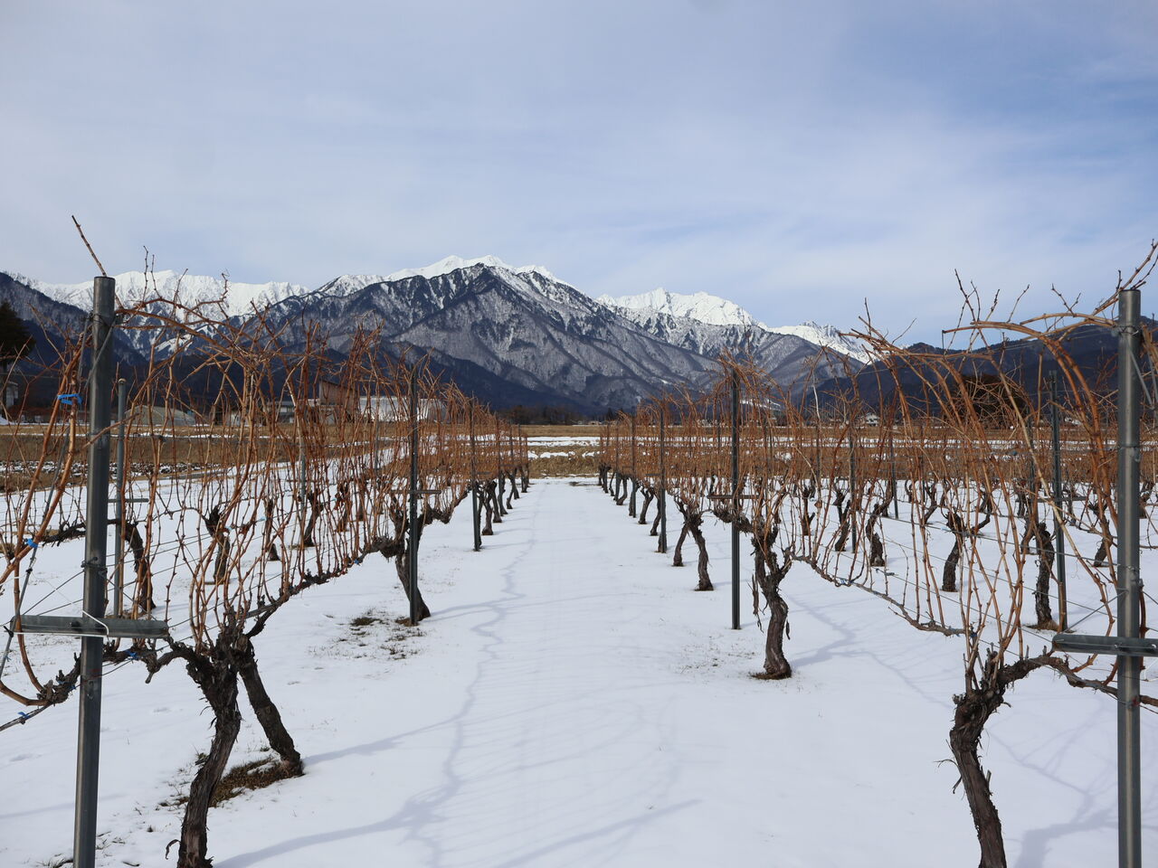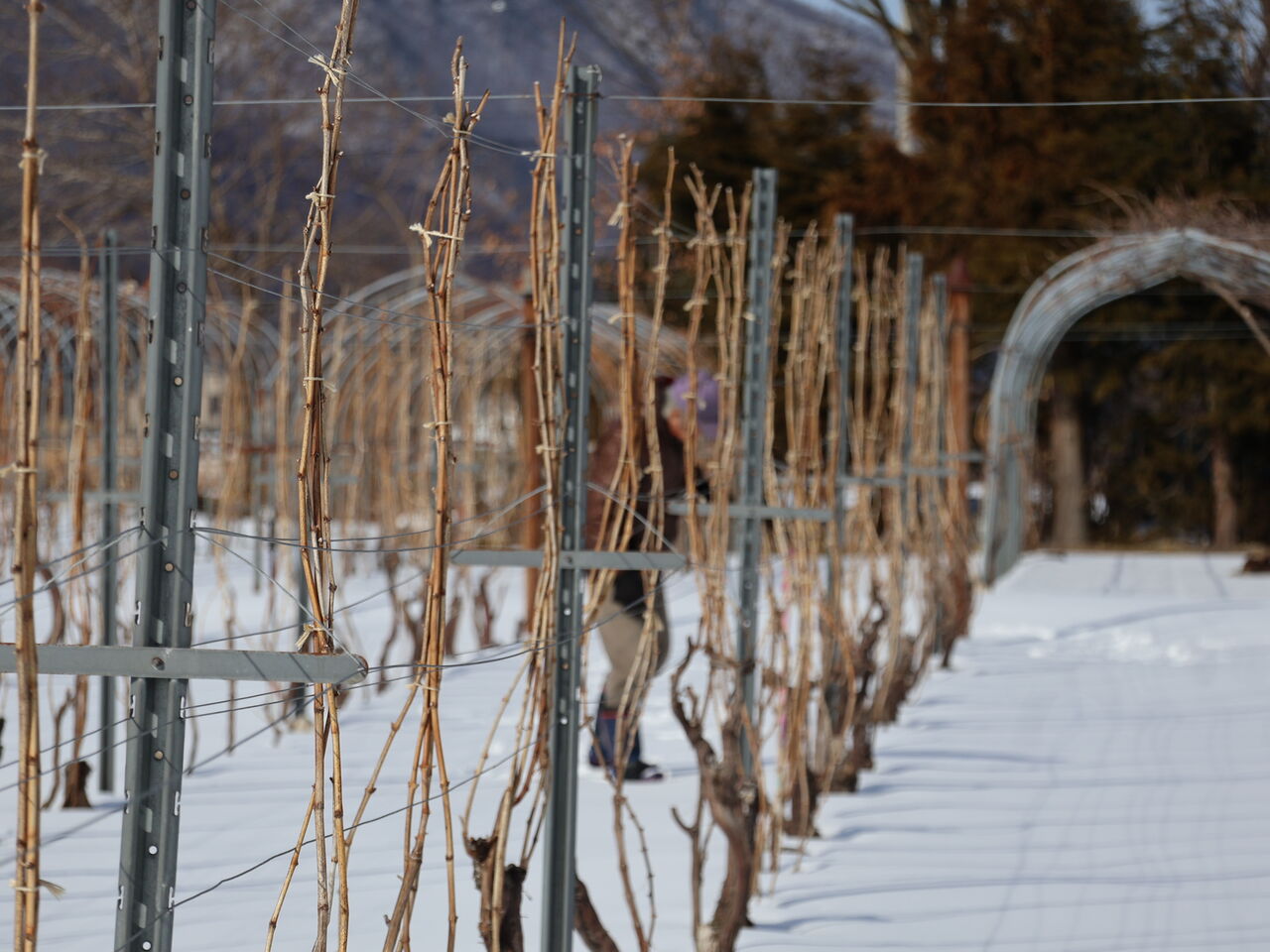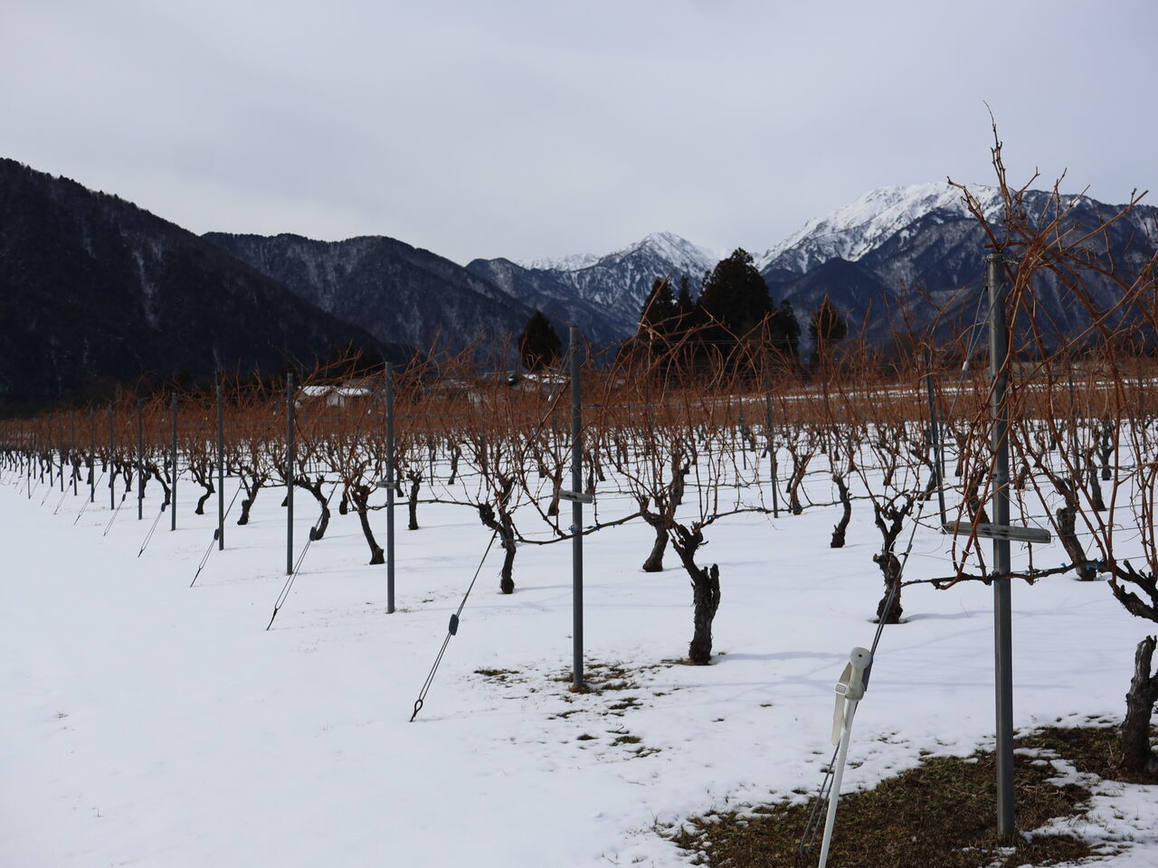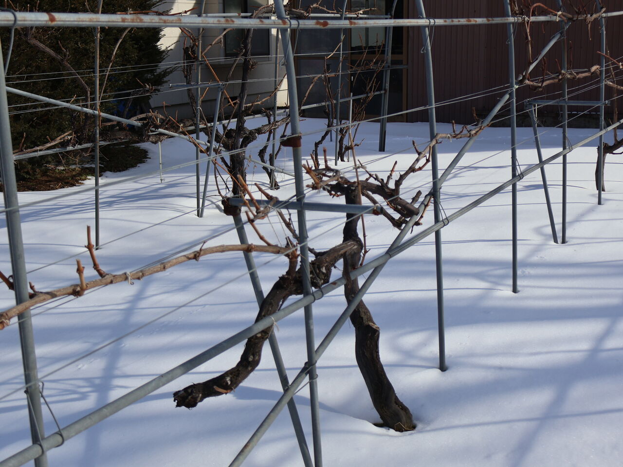 シャルドネの幹のまわりも、山の木々と同じように雪がとけています。