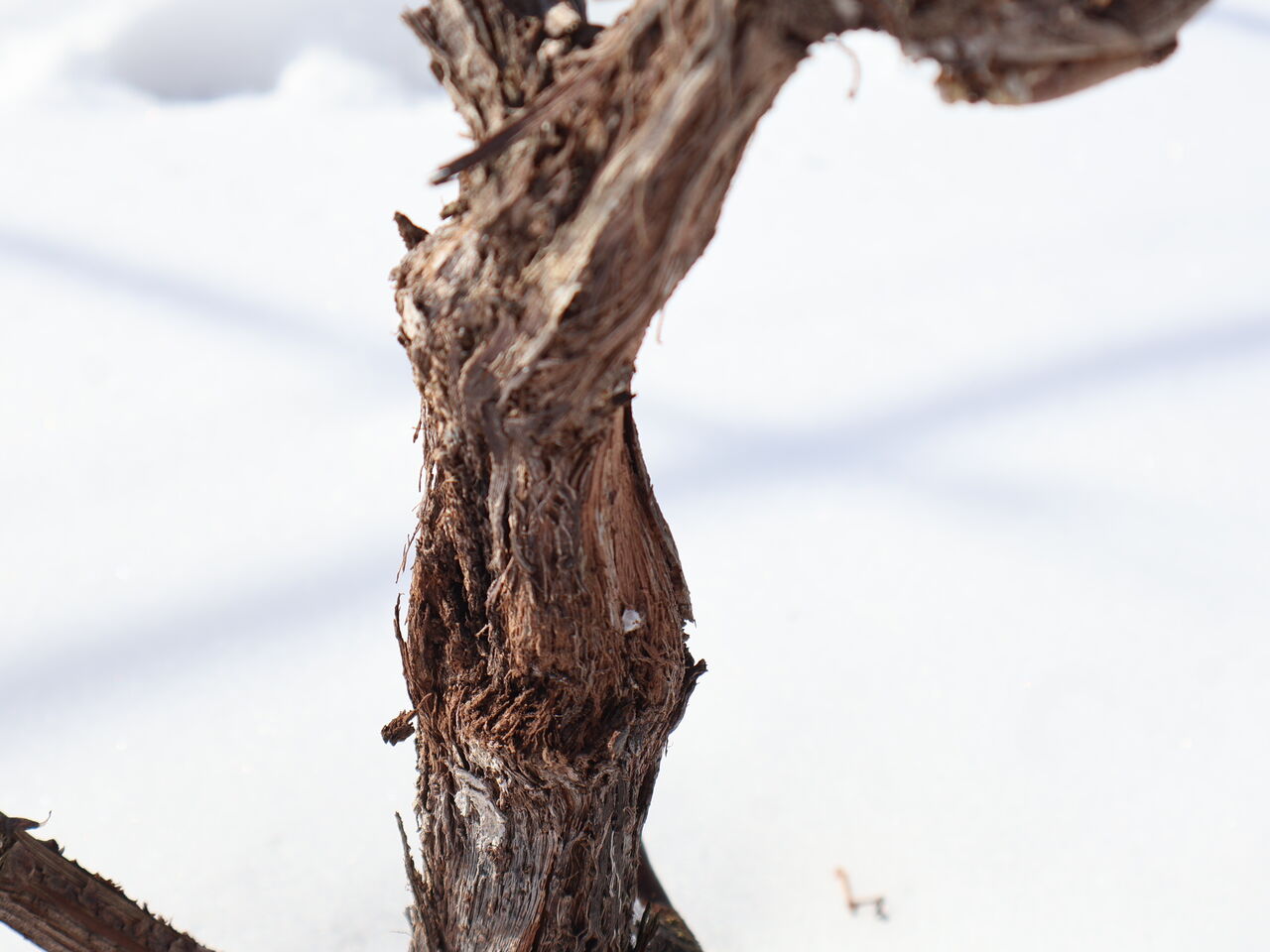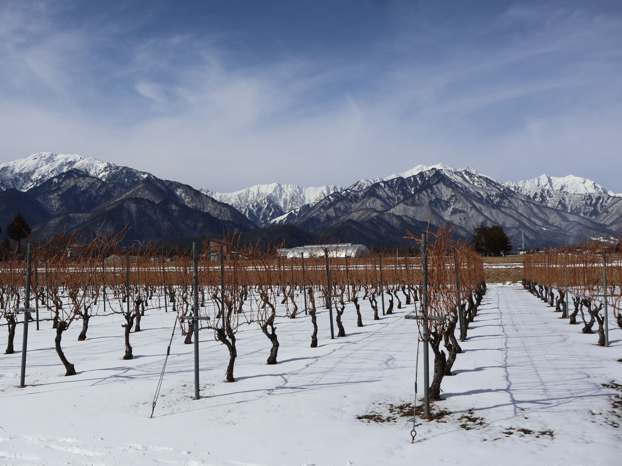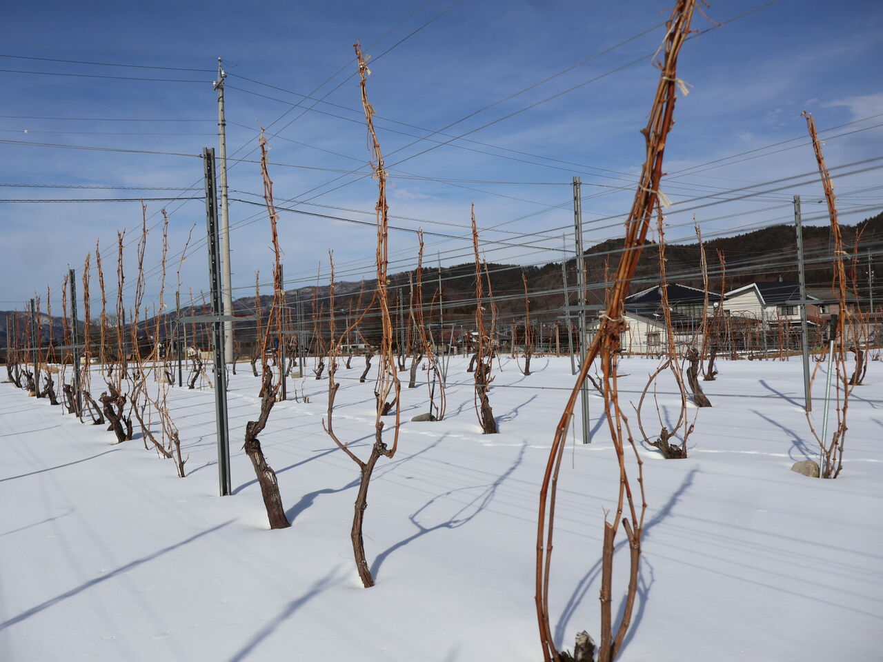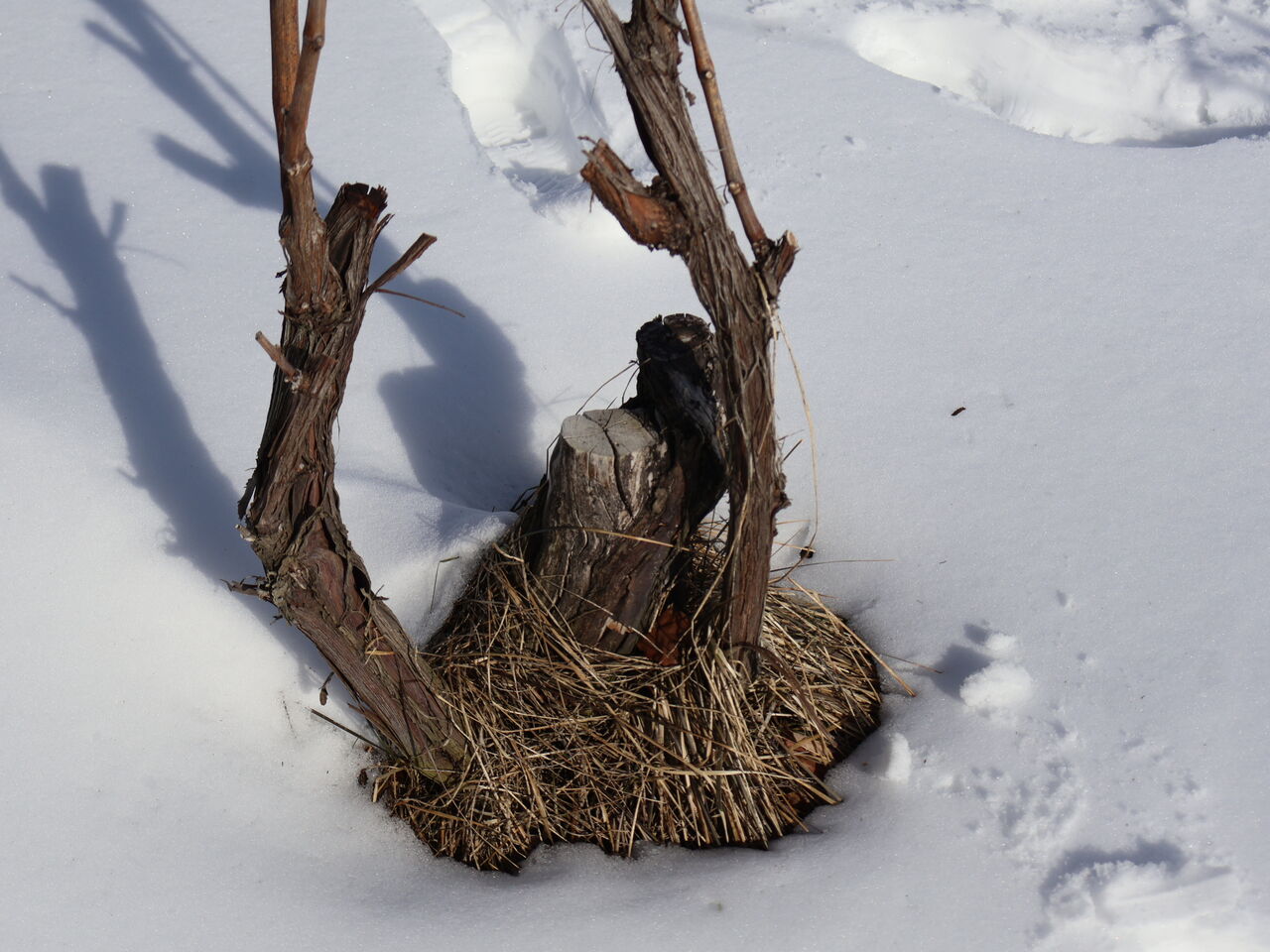 シャルドネの幹のまわりも、山の木々と同じように雪がとけています。