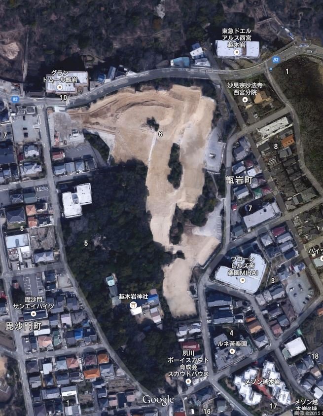 Googleマップの衛星写真から取得した、越木岩神社周辺。越木岩神社の東北側が更地になったマンション建築予定地。