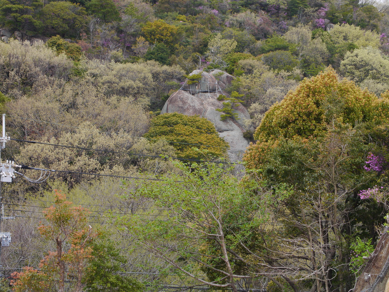 北山の岩も見える。今は樹木が多い茂ってしまって、多くの岩は隠されてしまっている。この辺りは単なる岩山ではなく、超古代、極めて重要な祭祀場所であったのではないかと思う。今はそのごく一部、「越木岩神社」だけがその名残として祀られている。