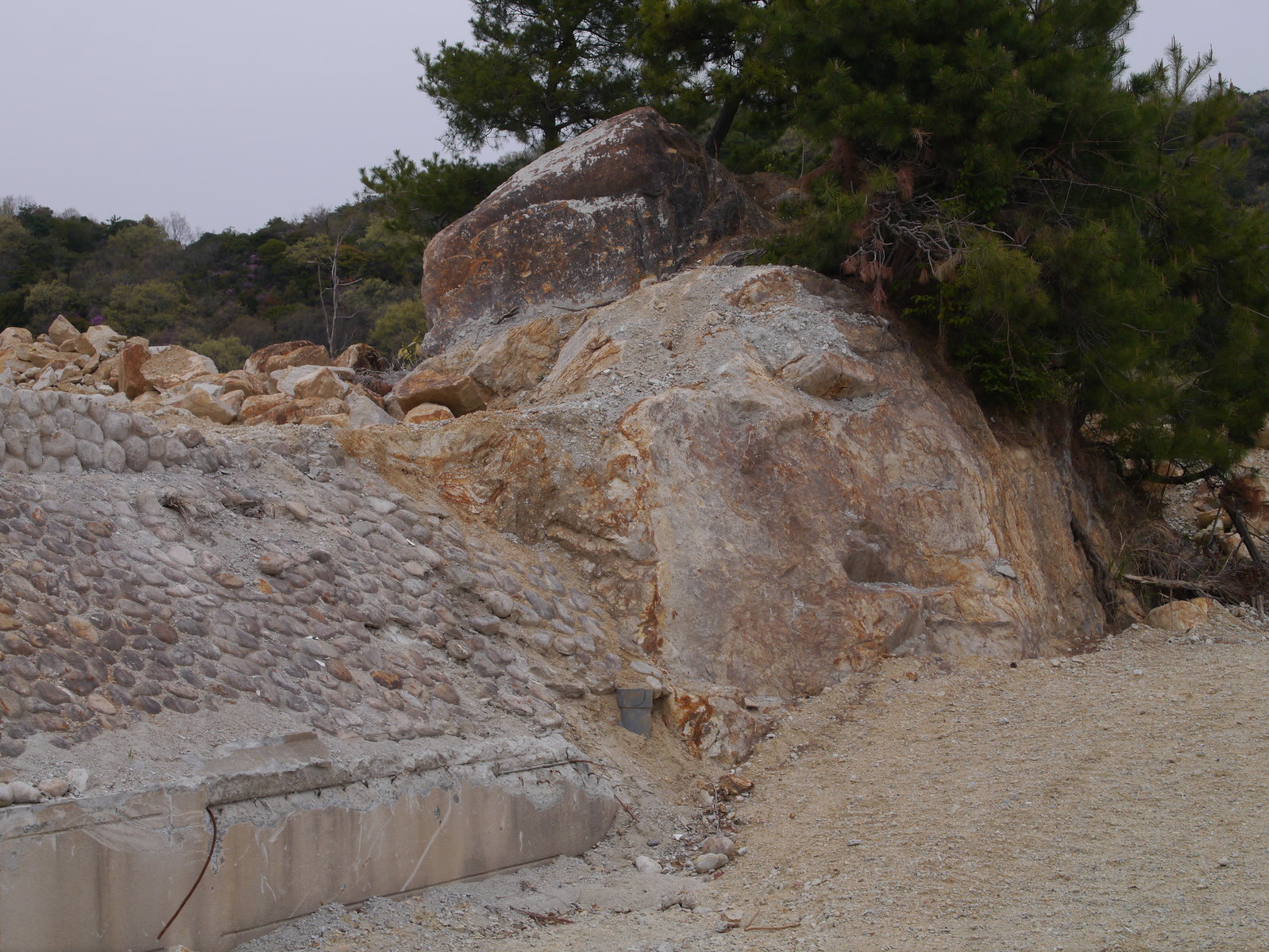 このようにかなり大きな岩もあるが、一部は削り取られてしまっている。この岩は中央部の緑の中に有るものだったと記憶している。