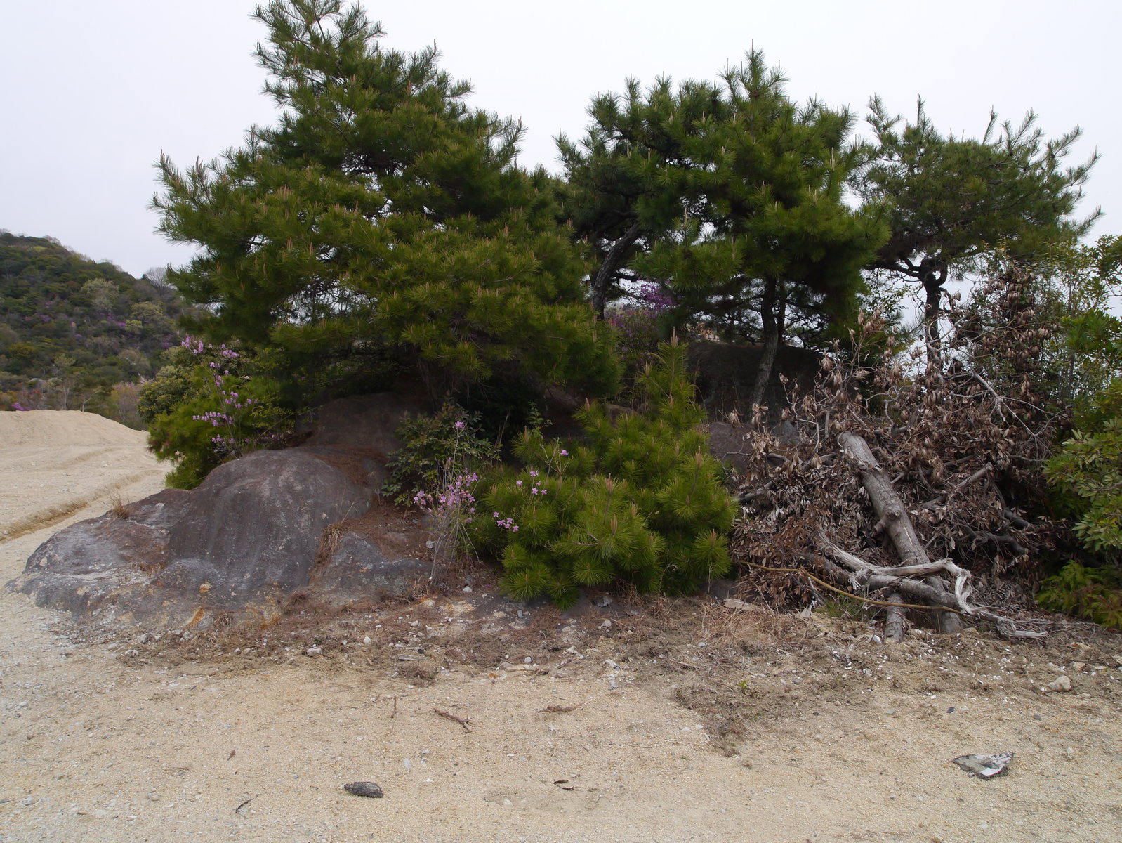 黒松が生え分かりにくくはなっているが明らかに岩が有る。