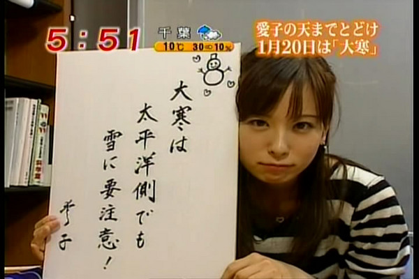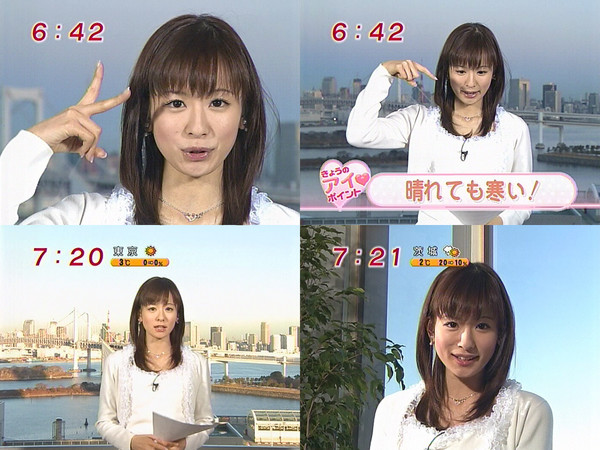 1 : グラドル(神奈川県):2007/07/27(金) 10:57:19 ID:P4gFAKmD0 ?PLT(12000) ポイント特典オリコン調査の「好きなお天気お姉さん」で、堂々の1位に輝いた皆藤愛子。千葉県出身の23歳。早大一文在学中の05年4月に、フジテレビの情報番組「めざましテレビ」で4代目お天気キャスターに就任、“朝の顔”として根強い人気を誇っている。「昭和のアイドルのように、日本の男が持つ永遠の“処女願望”を満たしてくれる久々の正統派。それが最大の魅力で、老若男女に幅広い人気があります」生写真とか関連グッズには、さぞ高値が付くだろうと思いきや、そうでもないらしい。「皆藤はマニア受けしません。妄想をかき立てられないからです。セックスの匂いがしないと、逆にネットオークションでも人気になりにくいのです」(業界関係者)なるほどね。