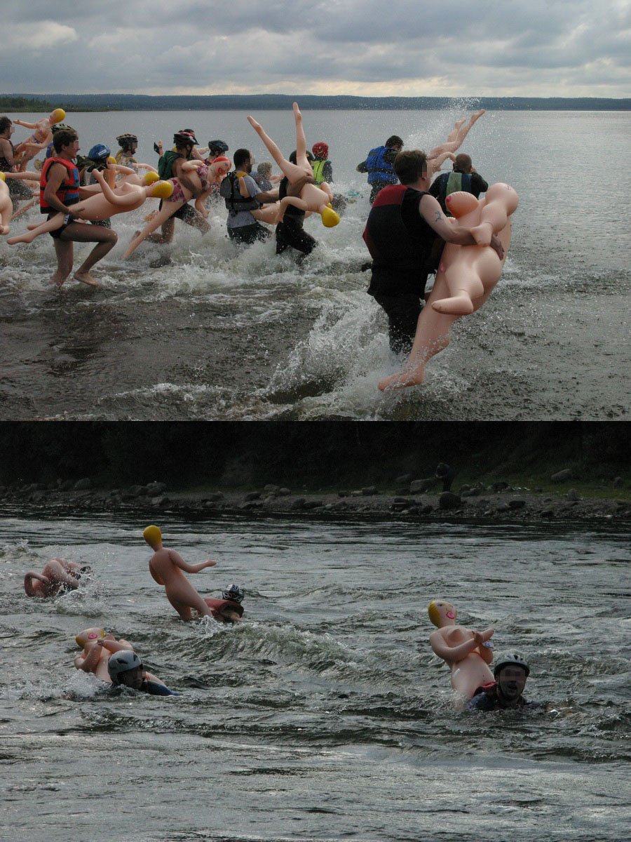 1 : 宇宙飛行士(埼玉県):2007/08/28(火) 23:30:18 ID:cox1KkHa0 ?PLT(14564) ポイント特典ロシア、サンクト・ペテルスブルクから電車で二時間、湖の町ロセボの夏の風物詩となる「Bubble Baba Challenge―ダッチワイフ乗りレース(babaはロシア語で田舎娘の意)」が、今年もヴオクサ川でひらかれました。今年で五回目を迎える「Bubble Baba Challenge」は、女性45名を含む365名の参加者によって競われ、一年の間に川下りで一人二人の行方不明者が出るというヴオクサ川の急流をダッチワイフを抱えたまま、予選、決勝と競技がおこなわれました。