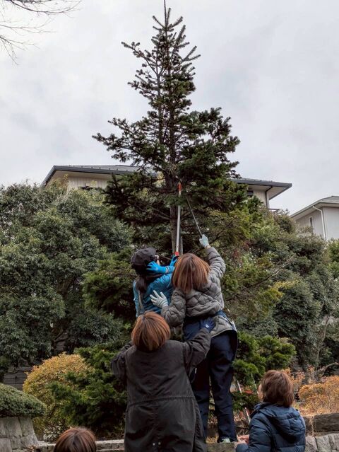 モミの木の高いところの飾りは慎重に、数人で協力して外しました。