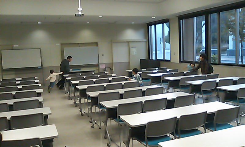 講演後、会場いっぱい使って鬼ごっこをしている子供たち。