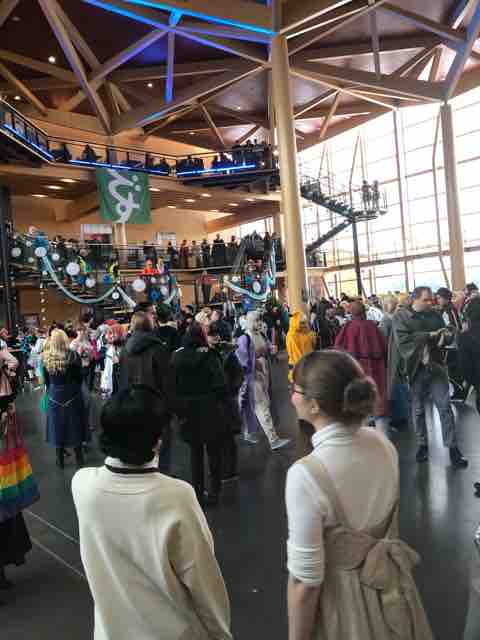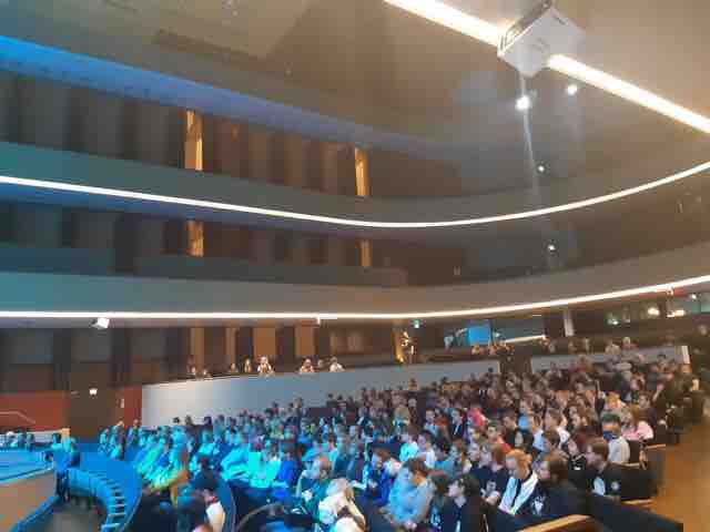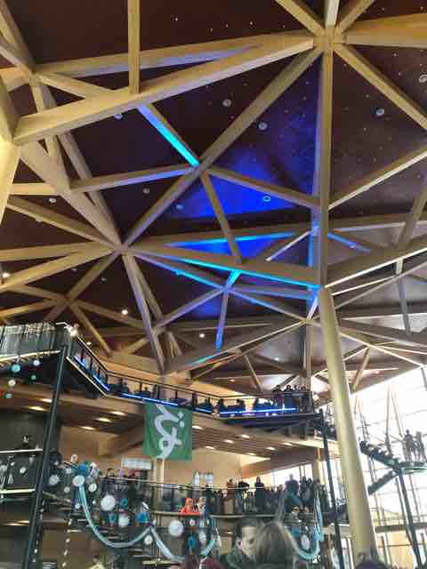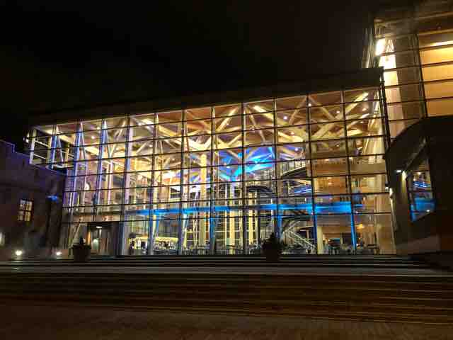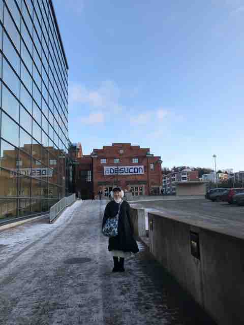 今回の目的地であるラハティ市のdescon会場(シベリウス・ホール)へ。ガラスとコンクリと木材の、これまたステキなデザインの建物。夜はさらにライトアップされて、外から見ても美しかったです。