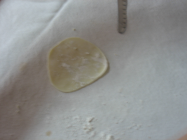 粉とお水だけで、簡単に作れて、しかもお水を付けて留めなくていいのが気に入りました。包み方はやはり真ん中をくっつけてから左右ひだを作るのですが今ひとつ適当です。どうぞお試しを〜手作りの皮は最高〜☆