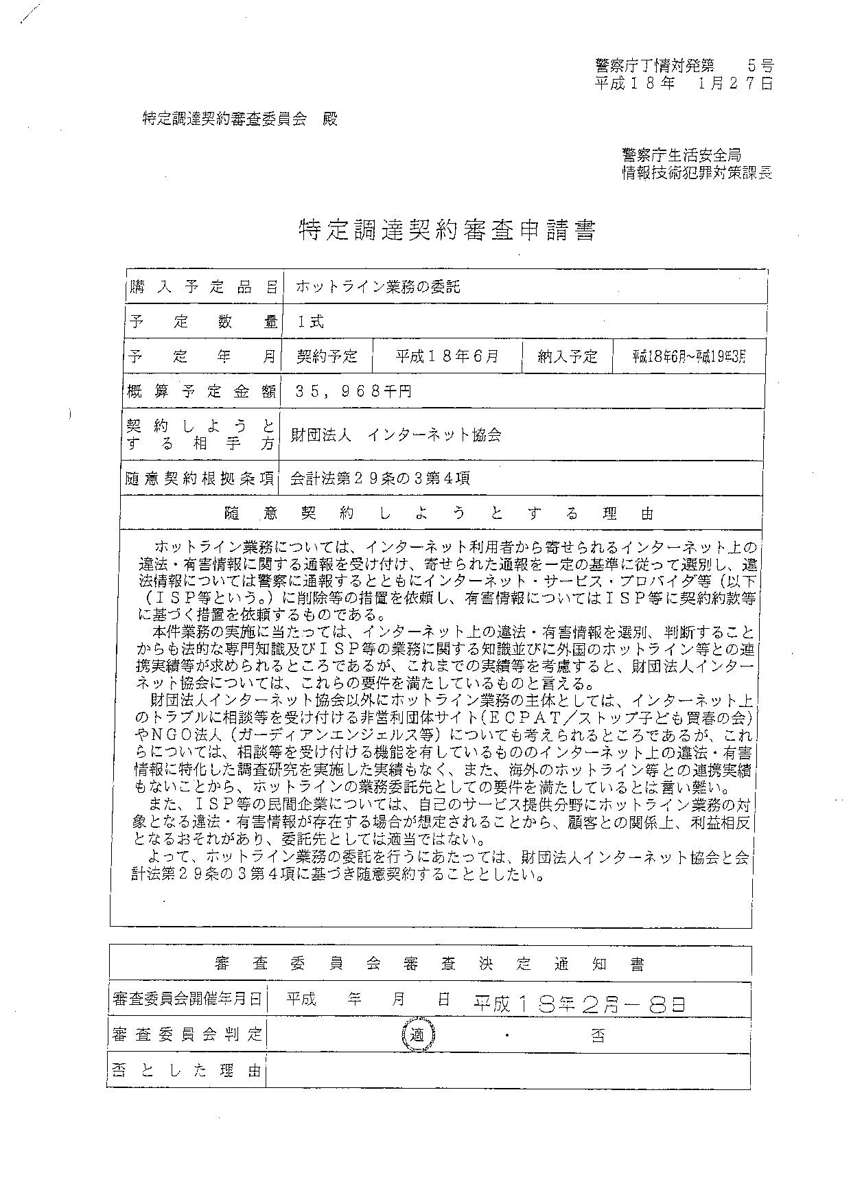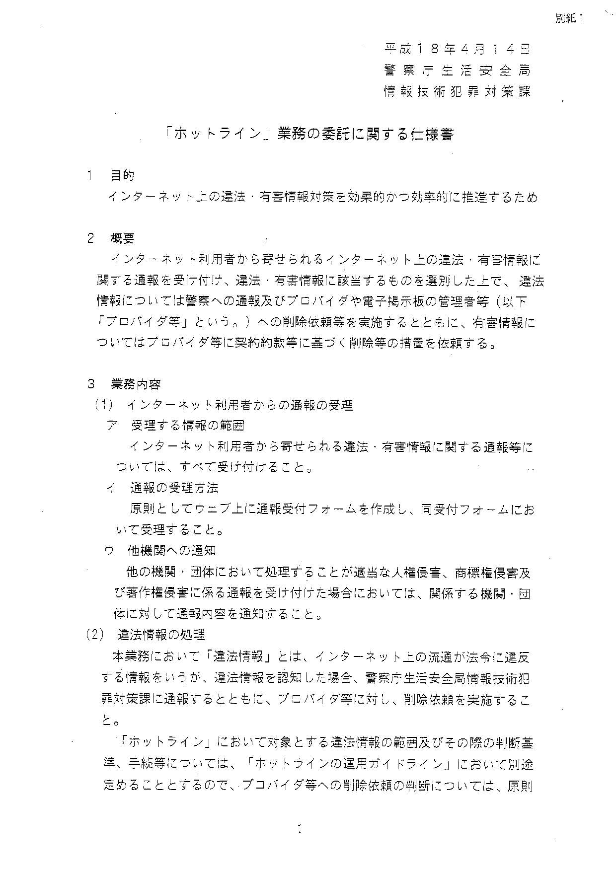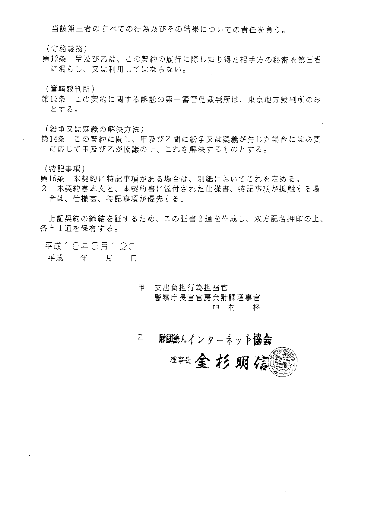 以下資料は全て、警察庁〜財団法人インターネット協会間に於ける“インターネット・ホットラインセンター”設立に関する契約書と、それに付随する資料である。