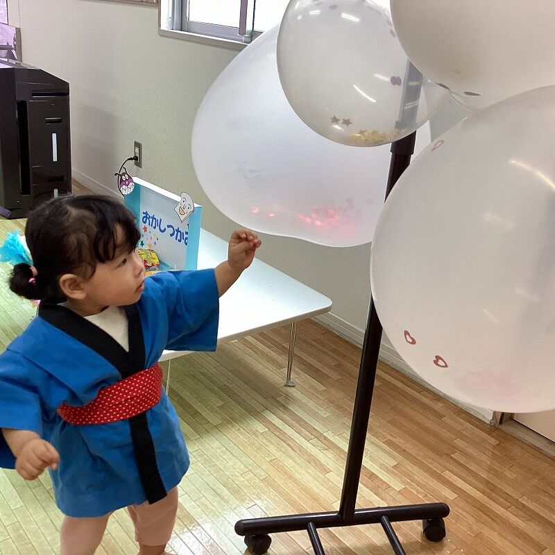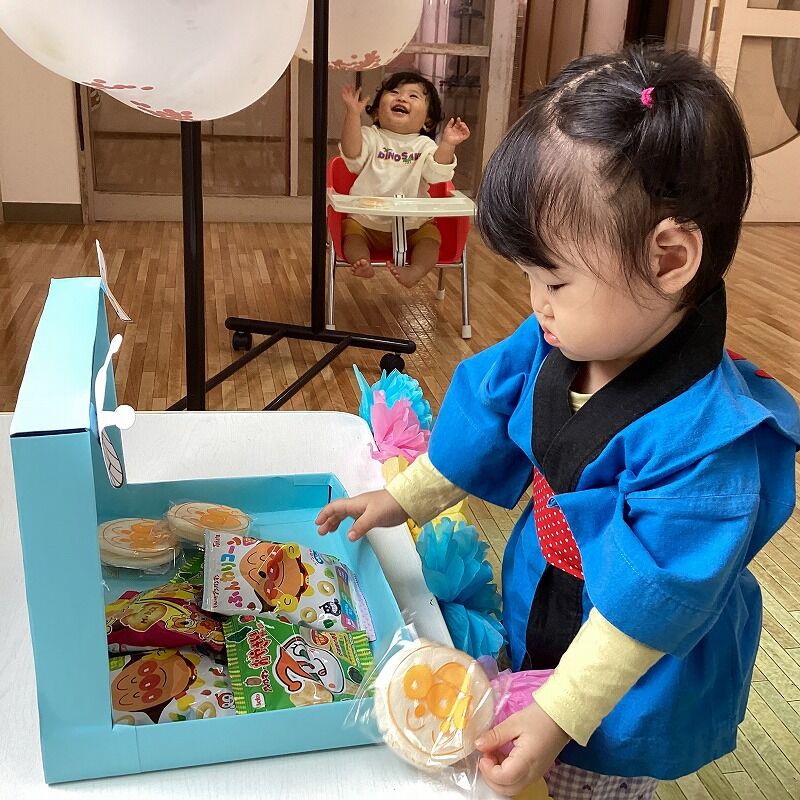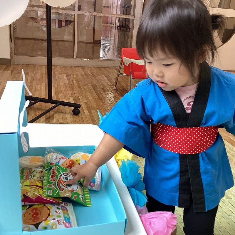 2024年11月08日 秋まつり【のぞみ保育園】 法被を着て、お菓子つかみや風船のひもクジをしました 自分の好きなお菓子をじ~っと選ぶ姿や、大きな風船に驚いたり、嬉しそうに笑ったりする姿がとっても可愛いかったですよ アンパンマンのメダルを最後に貰うと、目を輝かせていた子どもたちでした