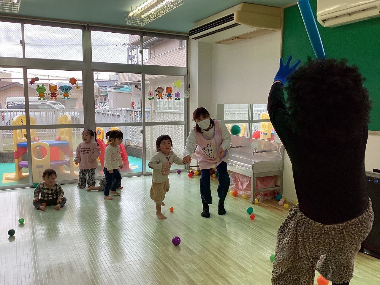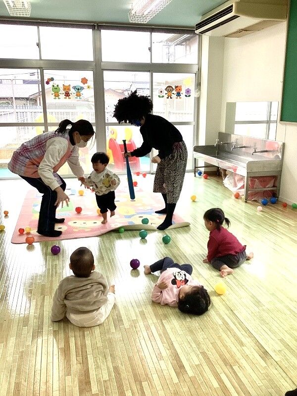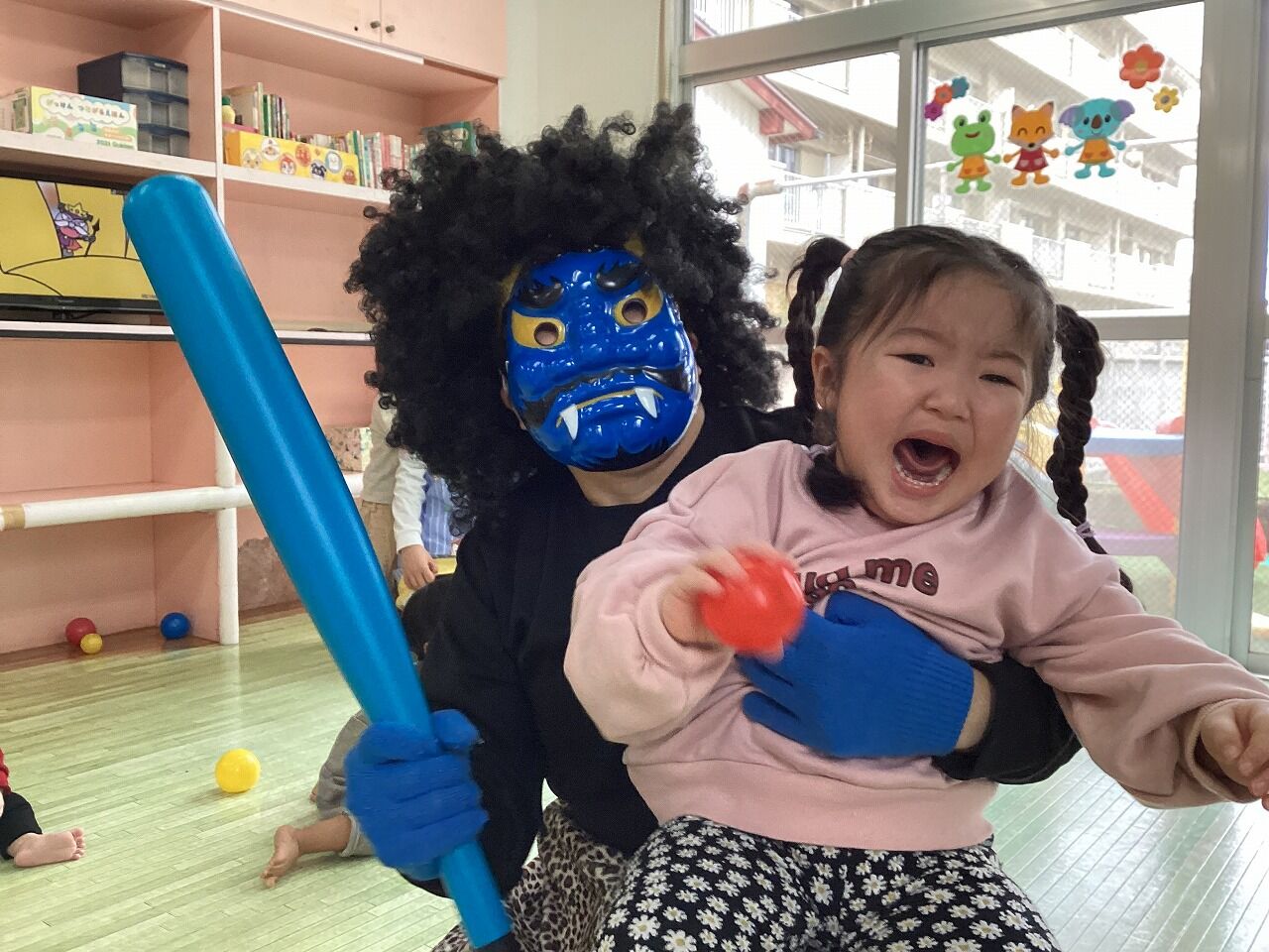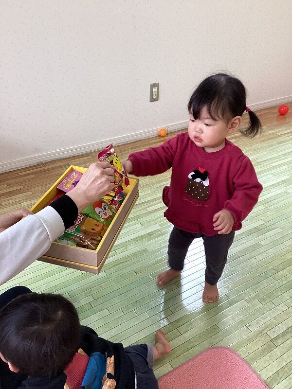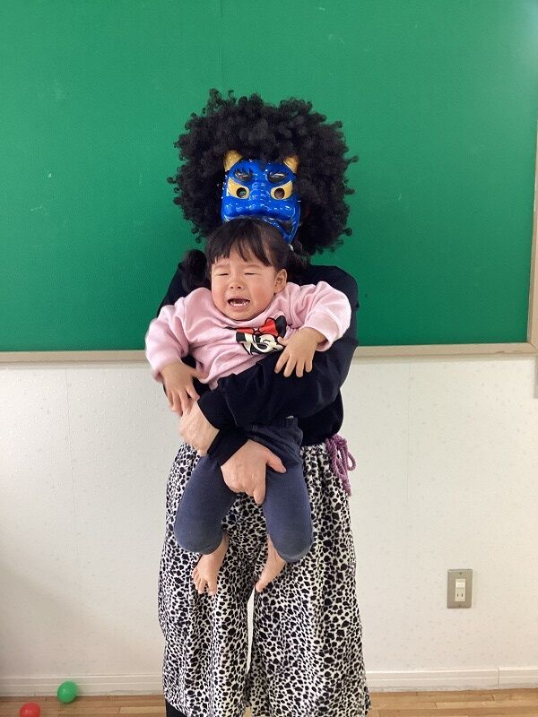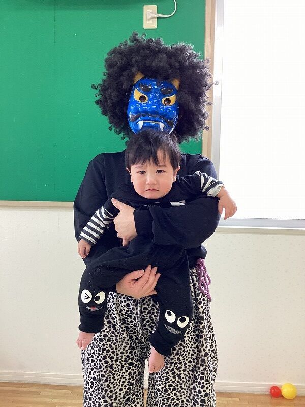 2025年02月26日 節分【のぞみ保育園】 鬼は~外!福は~内!とカラーボールで豆まきごっこをして遊んでいるところに、 忍び寄る鬼さん…‼ 最初は「だれ?」とキョトン顔でしたが、次第に怖くなり泣いて逃げる子、保育士にしがみつく子、ボールテントに隠れる子、横になってやられたフリをする子と様子様々でした 保育士と一緒に「鬼は~外~‼」と頑張って追い払い、最後はバイバ~イと手を振って鬼退治‼ みんな鬼さん追い払えたね!頑張ったね!とお菓子を選び受け取ると嬉しそうに持ち歩いていました 鬼退治が出来たので厄払いは十分 今年もみんなが健康で幸せに過ごせますように