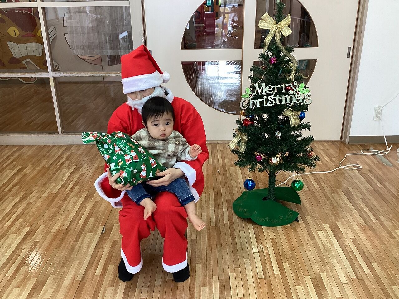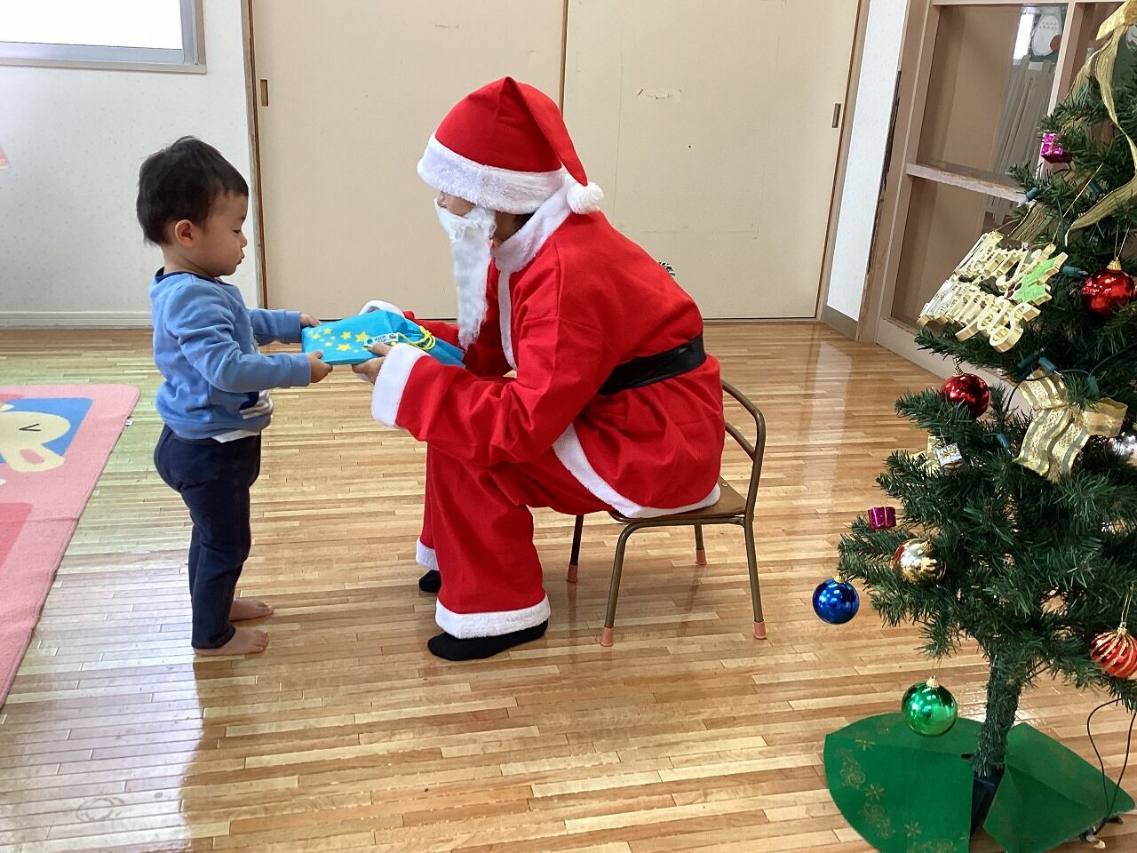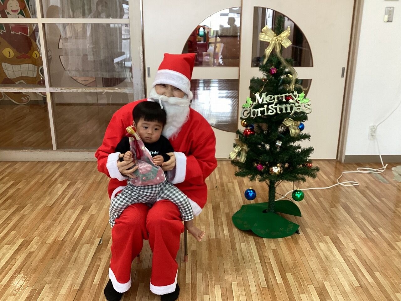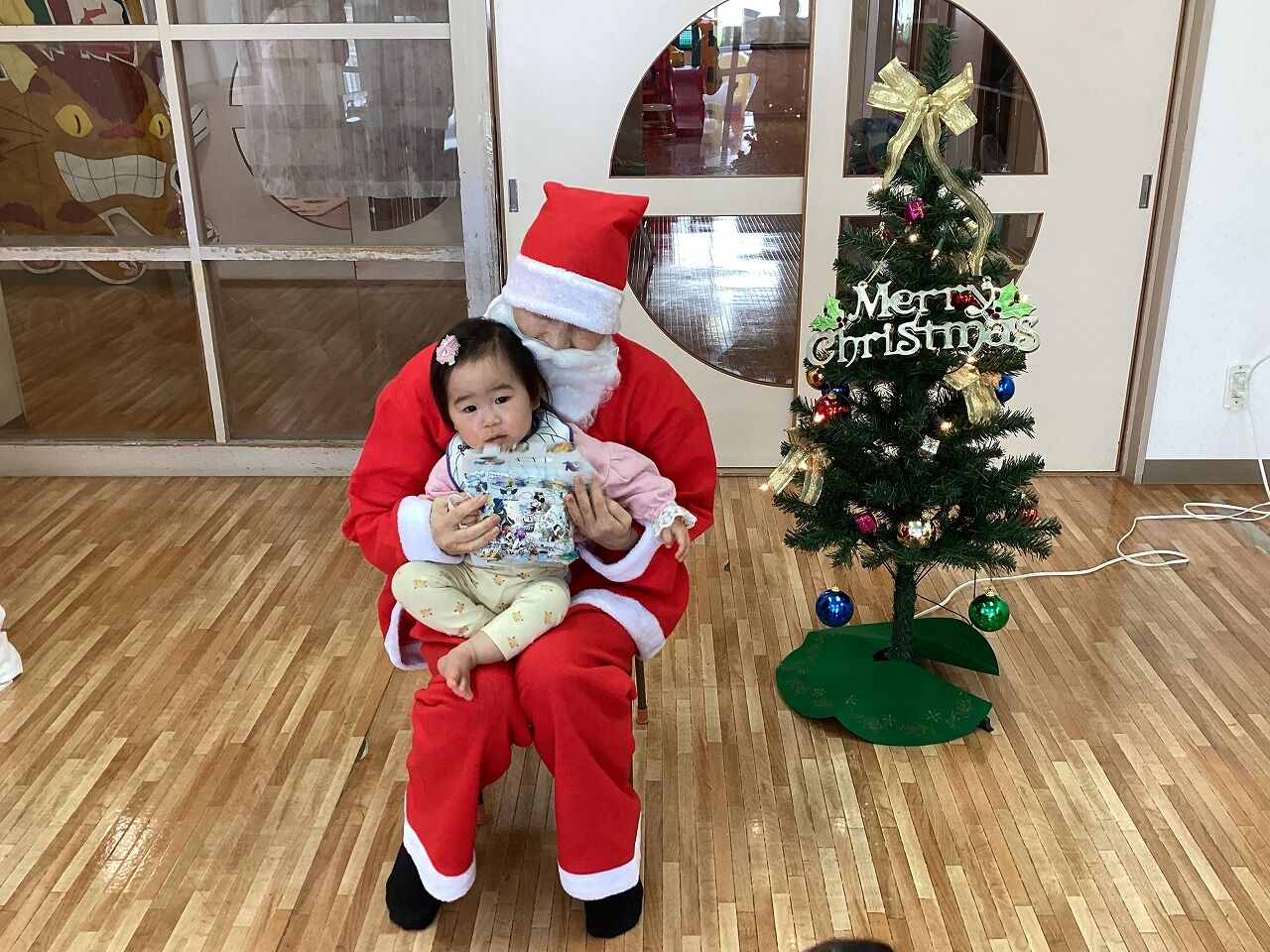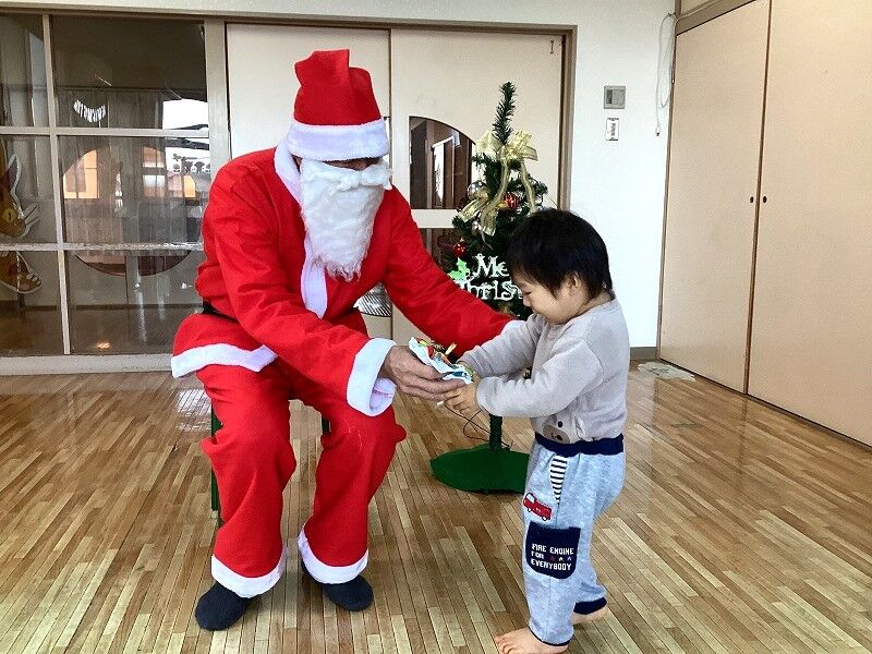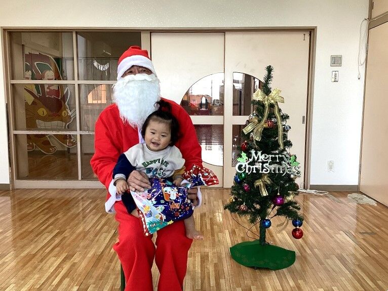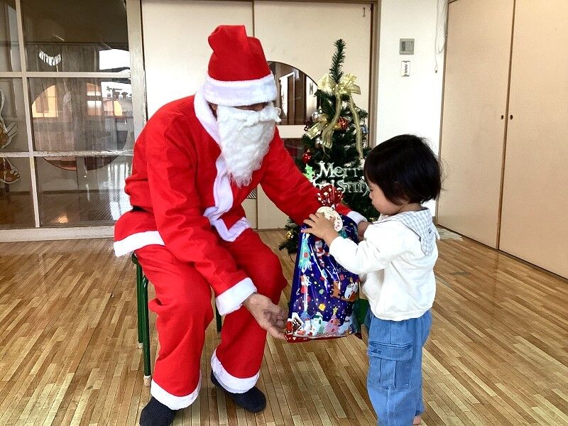 2025年01月06日 クリスマス会【のぞみ保育園】 今年ものぞみ保育園にサンタさんが来てくれました サンタさんの登場に驚いた表情の子や少し不安そうな表情になる子もいましたが、プレゼントを見ると「わ~!」と笑顔を見せて喜ぶ子もいましたよ 1人ずつ手渡しでサンタさんからプレゼントを貰うと、みんな大事そうにプレゼントを抱きかかえていました少し泣いてしまいながらも、大事なプレゼントはしっかり離さない姿も愛らしかったです サンタさんと写真も撮ってクリスマスの思い出が増えました