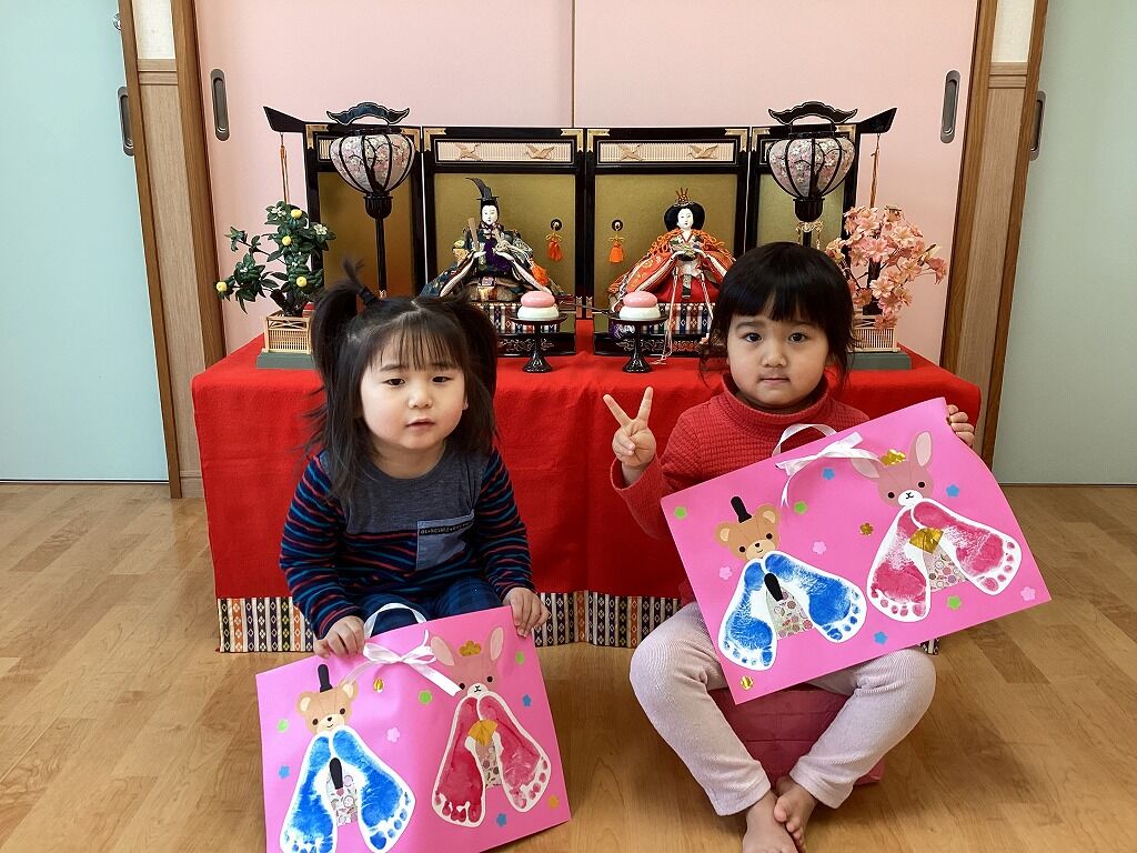 2024年04月09日 ひな祭り【のぞみ保育園】 ひな祭りの製作をしました足型を着物に見立てて、かわいいおひなさまが出来上がりました一人ひとりの足型を見ていると、大きくなったなあとしみじみしてしまいますこれからも元気いっぱい、おおきくなあれ