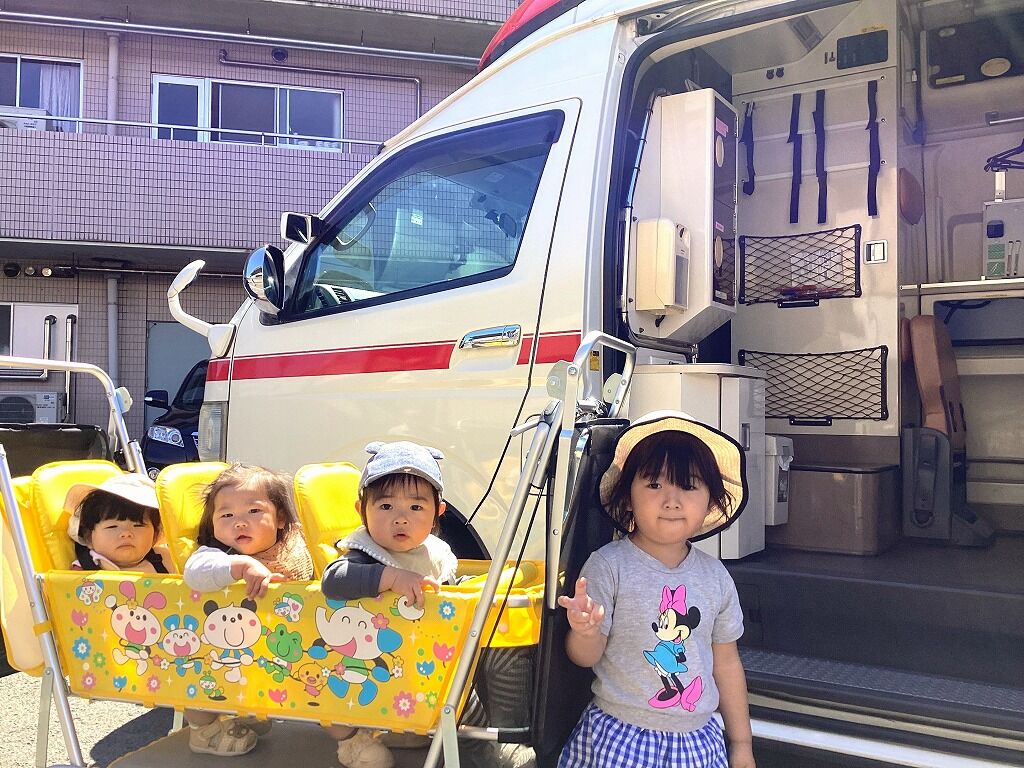 2024年06月25日 こいのぼり・お散歩【のぞみ保育園】 今年もこいのぼりを作りました こいのぼりに点シールを貼って製作しましたよ 出来上がったこいのぼりには、可愛い手形と顔写真も一緒に貼ってあり、子どもたちも興味深そうに見ていました みんながたくましく大きくなりますように お天気の良い日が続いたので、沢山お散歩にも出かけました 神社で遊んだり、電車を見に行ったり、子どもたちはいろんな物を見つけては指をさしたり声を出したりして、嬉しそうに教えてくれましたよ 大滝病院のブルドーザーや救急車も見せていただきました なんと運転席にも乗せていただいて、子どもたちも乗り物に興味津々、大喜びでした